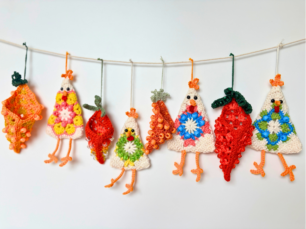 In dieser detaillierten PDF-Anleitung lernst du, wie du die lustigen „Crazy Chickens“ im Granny-Square-Stil und die passenden, mit Perlen verzierten Karotten häkelst. Die Karotten sind so entworfen, dass sie perfekt mit kleinen Schoko-Eiern gefüllt werden können – das ideale Gastgeschenk oder Highlight für deine Ostergirlande!