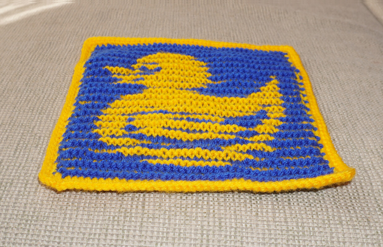 Das gestrickte Quadrat hat eine Größe von ca. 22 x 22 cm. Mehrere dieser Quadrate können zu einer beliebig großen Decke zusammengesetzt werden. Dazu eigenen sich besonders gut die anderen kleinen Motive wie z.B. der Adventsengel, die kleine Palme, Kirschen und Zitrone, den Pinguin oder auch das kleine Mystery, da sie alle die gleiche Größe haben.