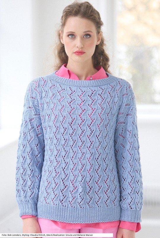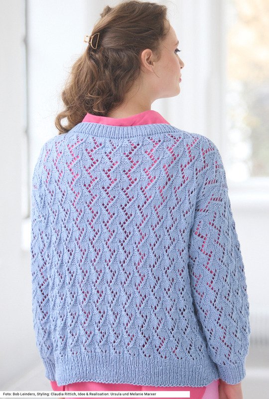 An dieses Ajourmuster können sich auch StrickerInnen mit ein wenig Erfahrung wagen. Es ist einfach zu stricken und hat einen kleinen Rapport. Außerdem sind alle Teile ganz gerade. Der Ärmel beginnt mit ca. der Hälfte der Maschen für den Bund im Rippenmuster, danach werden die nötigen Maschen zugenommen, um die Weiter zu erreichen. Auch der Bund und die Blende am breiten U-Boot-Halsausschnitt sind im 1/1-Rippenmuster gearbeitet. Ein luftiger Pulli also, der zu so vielem passt, was darunter durchscheinen darf. Die Anleitung für dieses Modell aus einem Garn aus Baumwolle und Polyamid gibts für die Größen 38/40, 42/44 und 46/48.