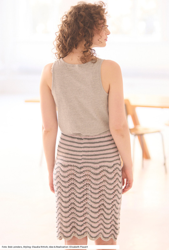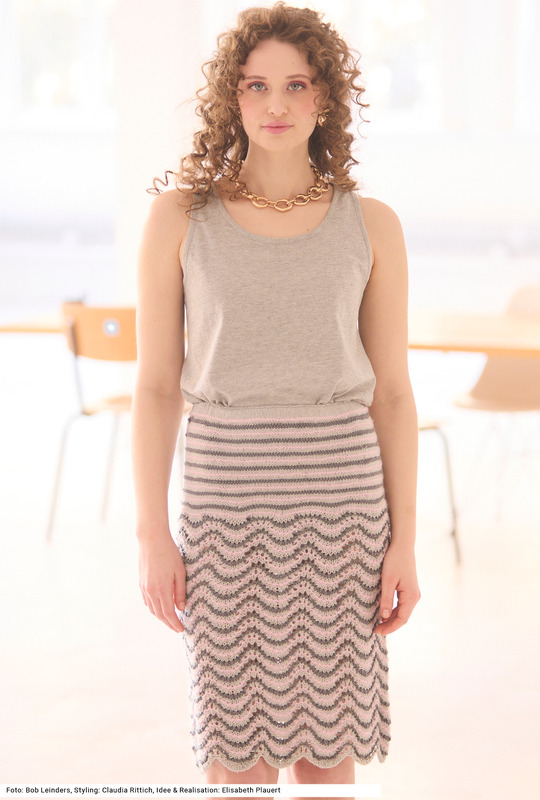 Dank schwungvollem Pfauenmuster und sanft fließendem Streifenmix wird dieser Rock zum Blickfang. Die harmonische Farbfolge in dreierlei Farben betont die raffinierte Struktur. Reine Baumwolle sorgt für Komfort – der doppelte Bund mit Gummizug für perfekten Sitz. Neben dem dominierenden Pfauenmuster kommt für das Querrippenmuster glatt rechts und kraus rechts sowie für den Bund glatt rechts zum Einsatz. Im unteren Bereich ist der Rock weit schwingend, nach oben hin werden innerhalb des Musters Maschen abgenommen, um an den Hüften schmal zu sitzen. Eine Anleitung kann für die Größen 36/38, 40/42 und 44/46 downgeloadet werden.