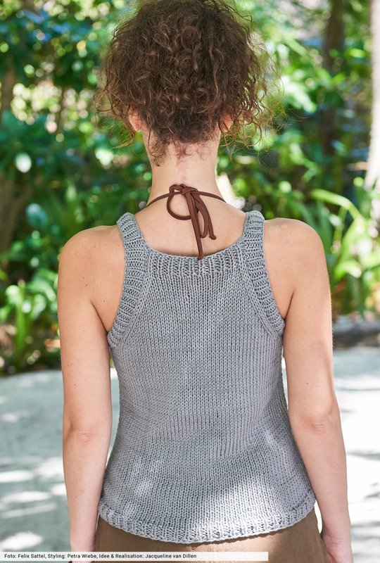Durch das griffige Garn aus ökologischer Baumwolle entsteht hier die klare Maschenstruktur. Das gilt nicht nur für die Glatt-rechts-Partien, sondern auch für den kleinen Ajourmustereinsatz im oberen Bereich. Hier musst du ein bisschen aufpassen, weil du gleichzeitig auch noch die sichtbaren Abnahmen für die Armausschnitte ausführst. Aber insgesamt ein tolles Top in ruhiger Farboptik mit moderner Ausstrahlung.