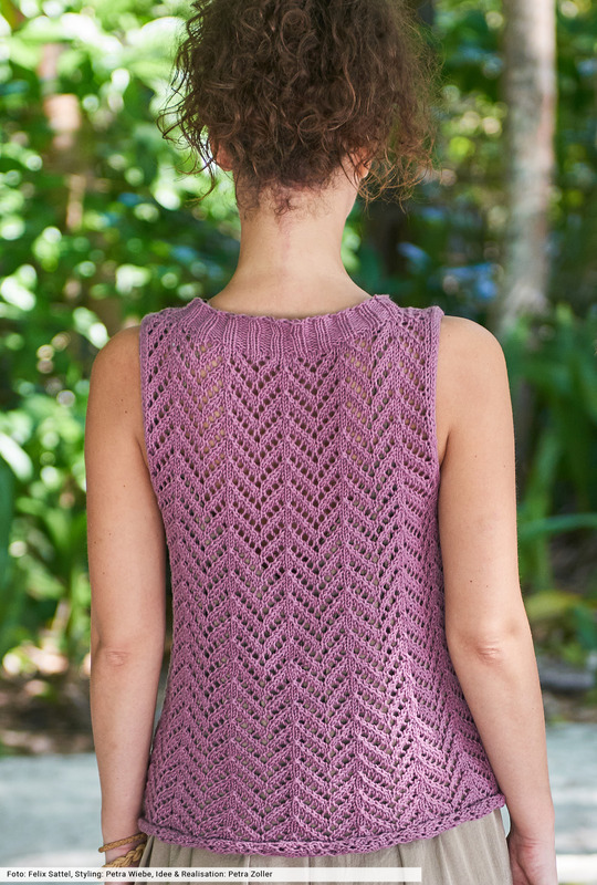Auf Zack, und zwar auf ganzer Linie, ist dieses unkomplizierte Top, das wir aus einem kühlen Baumwoll-Leinengarn gefertigt haben. Für das Ajourmuster gibt's eine übersichtliche Strickschrift, mit der du nach wenigen Reihen in den "flow" kommst. Die Ausarbeitung der I-Cord-Blenden an den Armausschnitten ist in der Anleitung genau beschrieben. Dann nur noch die breite Rippenblende am Halsausschnitt stricken, fertig ist ein unkomplizierte Kleidungsstück für deine Sommergarderobe.