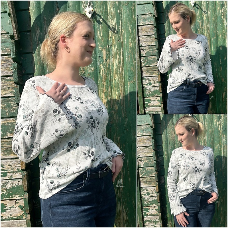 Bea ist ein bequemes und einfaches Basic Shirt das hauptsächlich auf Stoffe wie Rippjersey ausgelegt ist. Dabei verfügt es über eine angenehme, minimal taillierte Passform und einen Rundhalsausschnitt, der mit einer einfachen Einfassung für zusätzlichen Komfort sorgt. Der Ausschnitt kann bei Bea mit einer zusätzlichen Rüsche genäht werden, sodass bereits dadurch der Schnitt auch eine tolle Abwandlungsmöglichkeit beinhaltet. Wer es gerne noch verspielter möchte, kann den regulären Saumabschluss alternativ mit einer Abschlussrüsche nähen. Bea wird mit langen oder kurzen Ärmeln genäht. Diese sind sowohl in einer einfachen als auch in einer leicht ausgestellten Form als dezenter Trompetenärmel enthalten.