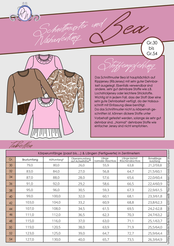 Das Schnittmuster ist in Größe 30 bis 54 gradiert, auf eine Körpergröße von 1,64m-1,65m ausgelegt und enthält keine Naht- oder Saumzugabe. In den Dateien findest du die A4-Versionen zum Ausdrucken, eine A0-Großdruckdatei sowie die Beamerdatei - alle Versionen inkl. Ebenen zum Ein- und Ausblenden der Größen. Bea ist hauptsächlich auf Rippjersey ausgelegt.