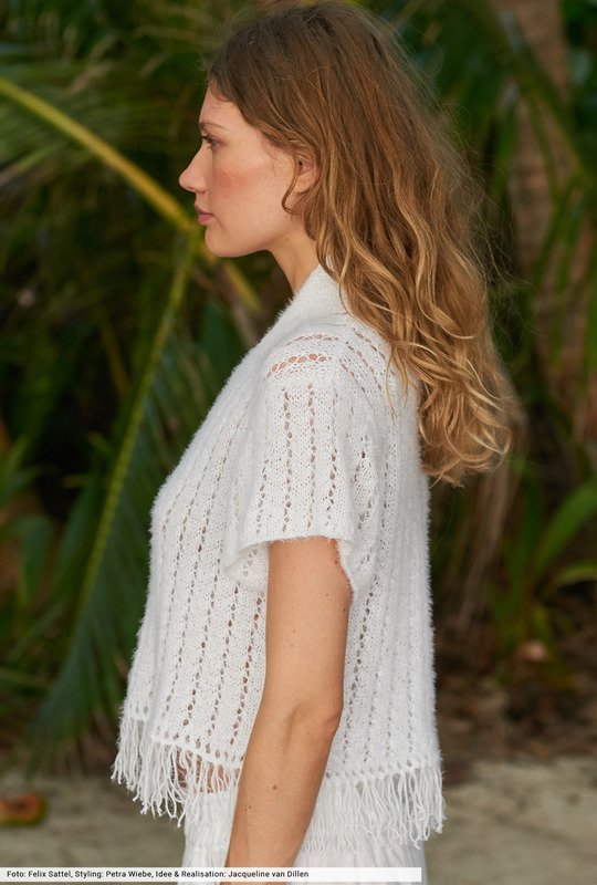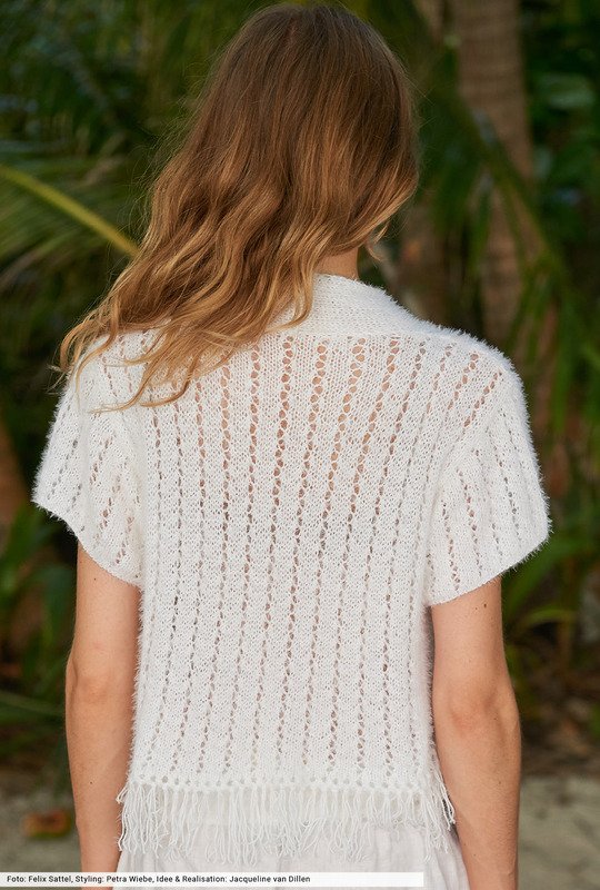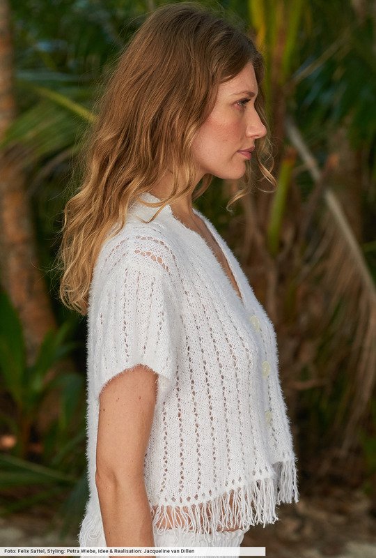 Klares Weiß trifft auf starke Details. Hier sind es lange Fransen, die in den unteren Jackensaum eingeknüpft sind. Außerdem schmückt ein Reverskragen die Vorderteilschrägungen. Als Verschluss dienen drei Knöpfe, die du direkt beim Hersteller via Internet bestellen kannst. Das fluffige Fancygarn gibt den allover angelegten Lochstreifen genügend Entfaltungsspielraum und sorgt durch seine Softness für die weich fallende Silhouette.