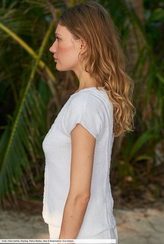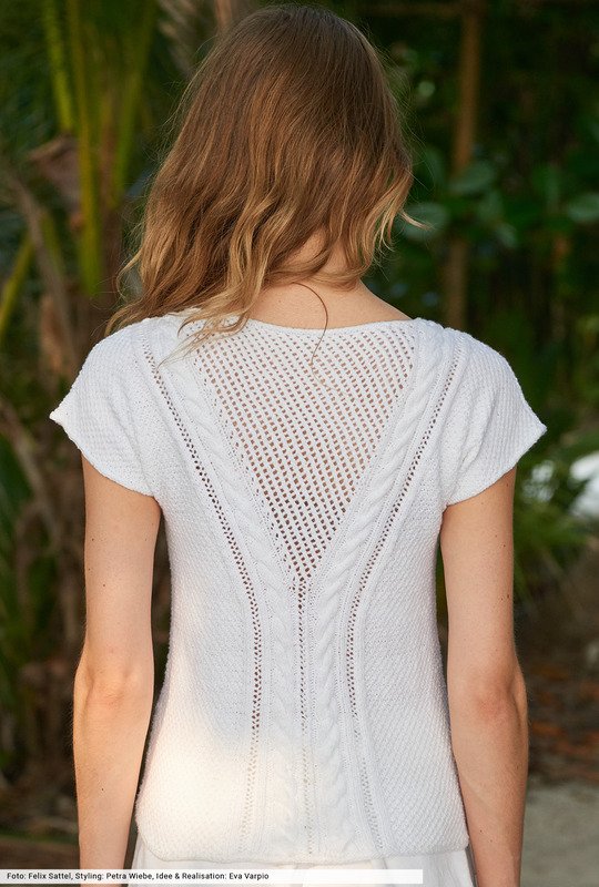Zuerst ist alles ganz einfach: in der Mitte der Zopf mit Lochstreifen, beidseitig davon das große Perlmuster. Bei der Gestaltung des V-förmigen Einsatzes heißt es jedoch aufgepasst. Wir haben die Vorgehensweise in unserer Anleitung genau erklärt und mit etwas Übung und Geduld kommst du zu einem aparten Top mit angestrickten Kurzärmeln. Aus kühlem Baumwoll-Polyamidgarn eine Wohltat auf der Haut.