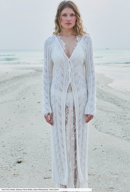 Minimal in der Farbe, maximal in der Wirkung: Mit diesem knöchellangen, schmal geschnittenen Mantel stehst du auf jeder Beachparty im Mittelpunkt. Er besteht aus einem feinen Baumwoll-Viskosegarn, dem wir zusätzlich einen flauschen Mohairfaden hinzugefügt und zusammen verstrickt haben. So kommen die Ajourstreifen und Rippenstrukturen noch deutlicher zur Geltung und du bist an kühlen Sommerabenden von Kopf bis Fuß weich umhüllt.