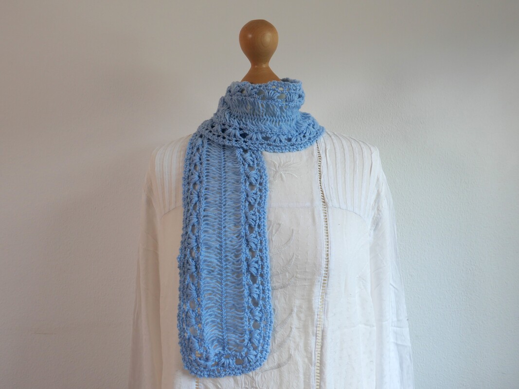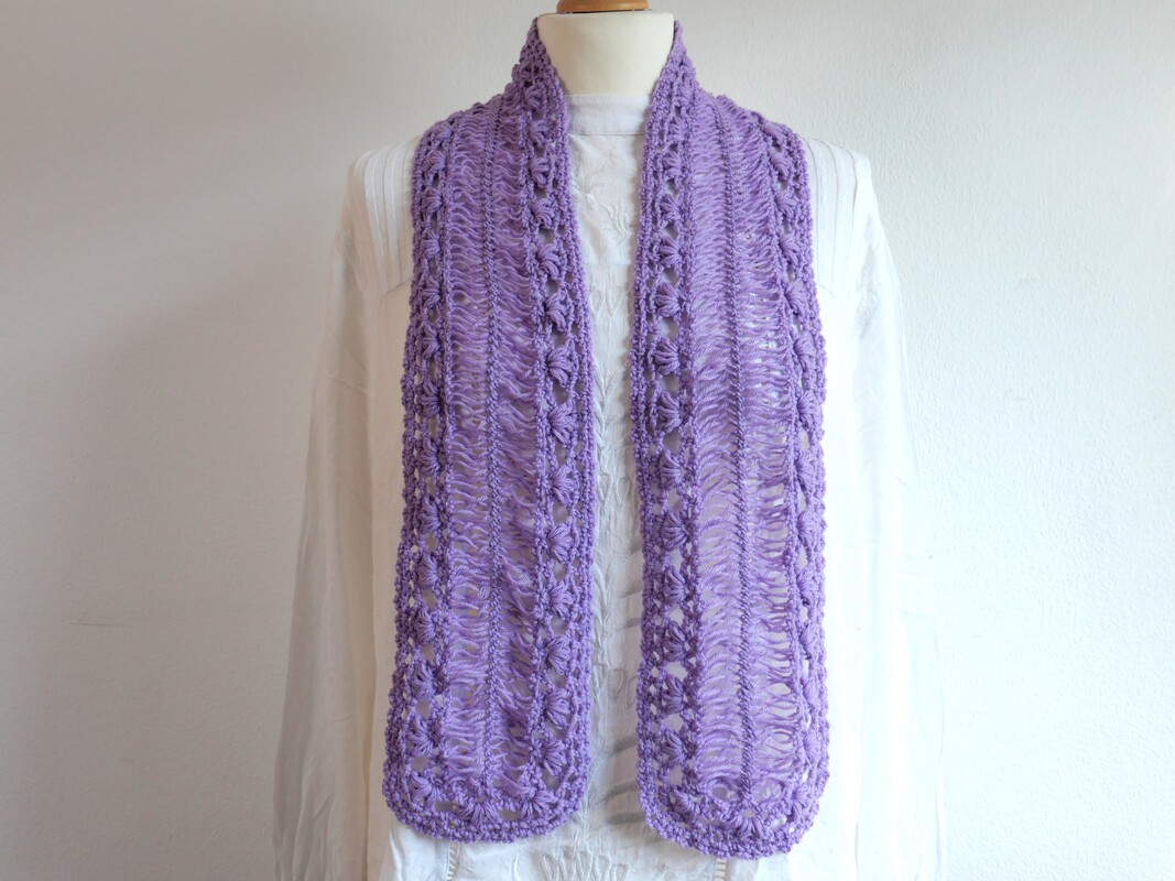 Der fertige Schal überzeugt mit einem zarten, dekorativen Muster und einem modernen Look, der jedes Outfit aufwertet – ob als leichtes Accessoire für den Alltag oder als besonderes Highlight.