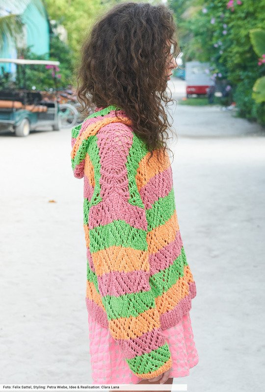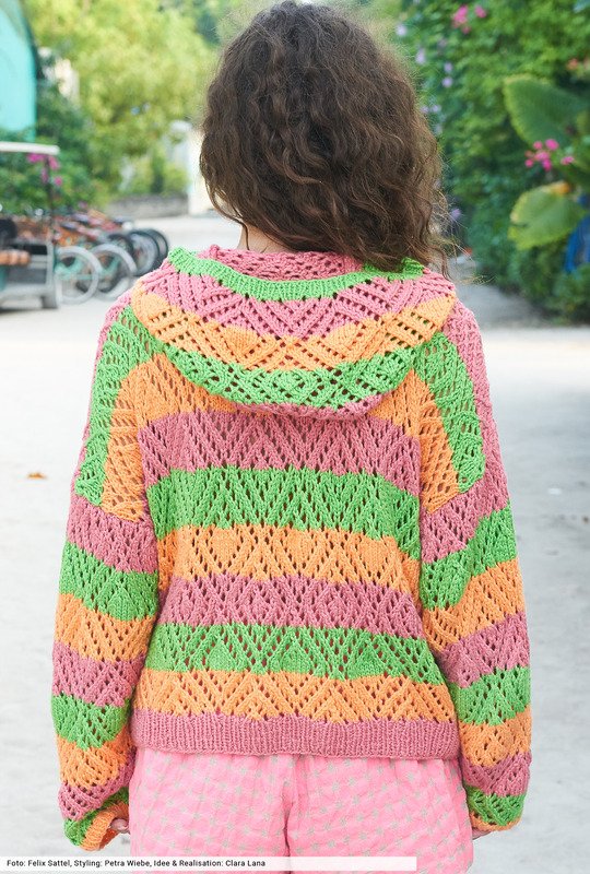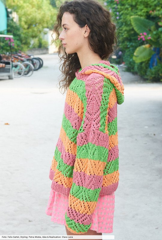 Jetzt schmeckt der Sommer nach Aprikose, Himbeere und Apfel. Kleiner Appetitanreger ist dieser sportliche Pulli, bei dem sich die Farben im regelmäßigen Streifendesign präsentieren. Die Basis bildet ein weiches, leicht aufgerautes Baumwollgarn, das sich angenehm auf der Haut trägt. Für das großflächige Rauten-Lochmuster findest du in unserer Anleitung eine übersichtliche Strickschrft. Die separat gestrickte Kapuze wird unter die Halsblende genäht und sorgt für den lässigen Auftritt.
