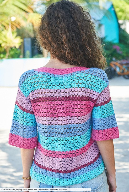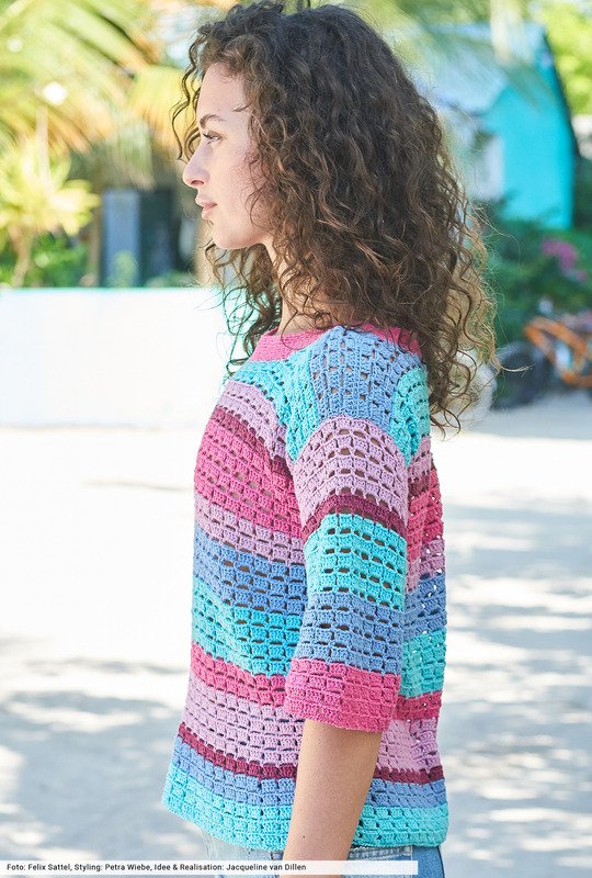 Anziehen, rausgehen und den Sommer leben – mit diesem hübschen Häkelshirt aus fünf verschiedenen Farben geht's direkt an den Strand. Das kühle Seiden-Baumwollgarn bildet die perfekte Basis und verspricht höchsten Tragekomfort. Für das interessante Muster haben wir eine Häkelschrift angefertigt, mit der du schnell zum Erfolg kommst. Die gerade geschnittene Silhouette ist anfängerleicht und auch die breite Halsblende häkelt sich nach wenigen Runden wie von selbst.