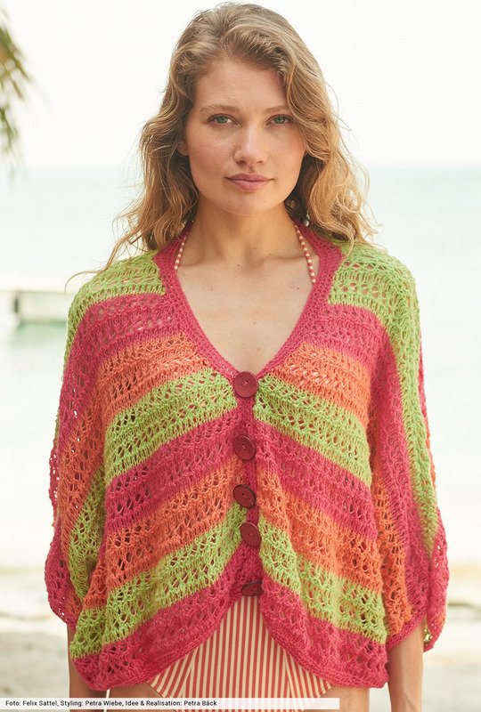 Der Sommer wird bunt. Dieses Motto gilbt auch für die kurze und locker fallende Jacke, die wir aus einem weichen, leicht aufgerauten Baumwollgarn gestrickt haben. Das markante Lochmuster überzeugt durch die transparente Optik und durch den gleichmäßigen Farbwechsel in Koralle, Limette und Orange. Zum Schluss nur noch die Blende anfertigen und die Knöpfe annähen – fertig ist ein Highlight, das dir auch noch in der nächsten Saison gefällt.