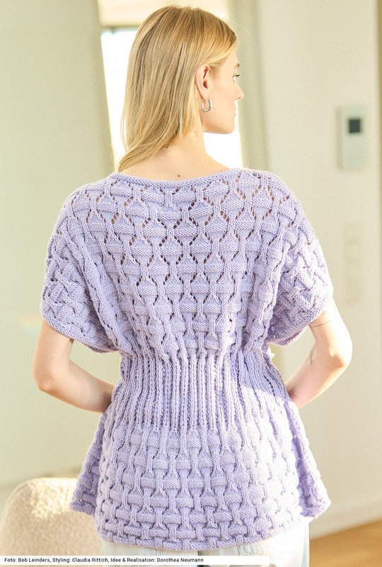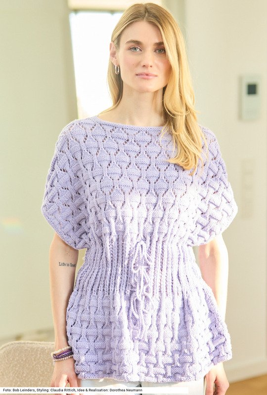 Wer das Besondere liebt, liegt bei dieser Tunika richtig. Sie kombiniert ein plastisches Ajourmuster mit markanten Rippenpartien, die dekorativ und formgebend zugleich wirken. Der lockere Schnitt mit stark überfallenden Schultern erhält durch eingezogene Kordeln eine sanfte Taillierung, sie werden doppelfädig aus Luftmaschen hergestellt. Der flache runde Halsausschnitt und die Armausschnitte haben schmale glatt links gestrickte Blenden. Gearbeitet ist dieses Modell aus einem pflegeleichten Garn aus Polyacryl und Viskose. Eine Anleitung kann für die Größen 36/38, 40/42 und 44/46 downgeloadet werden.