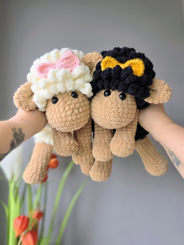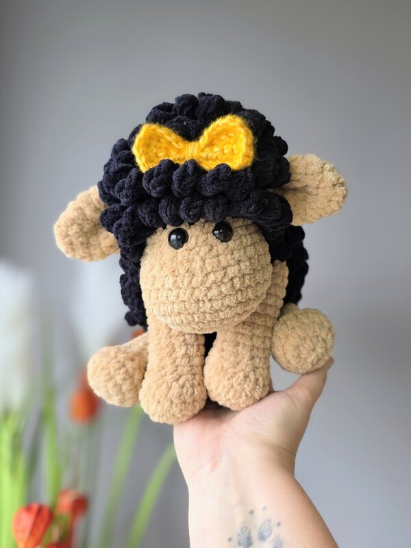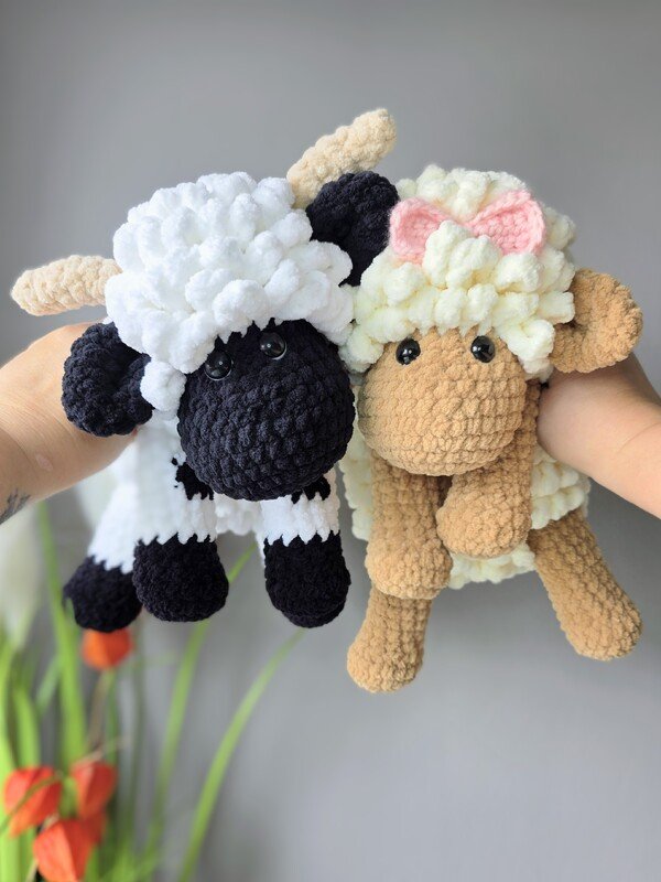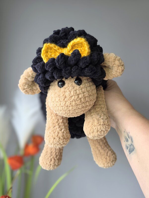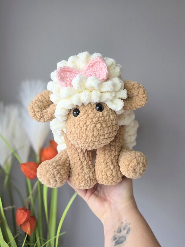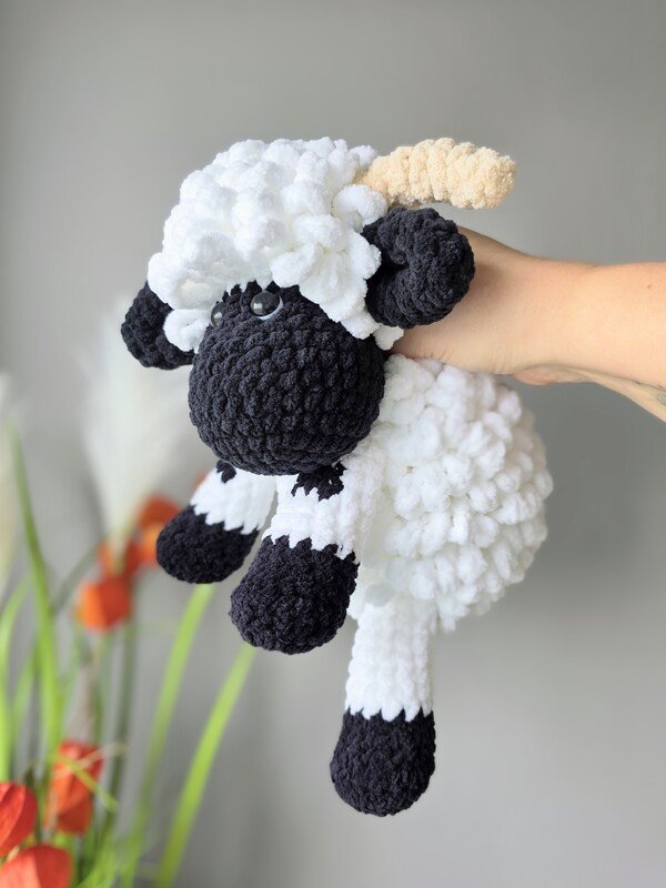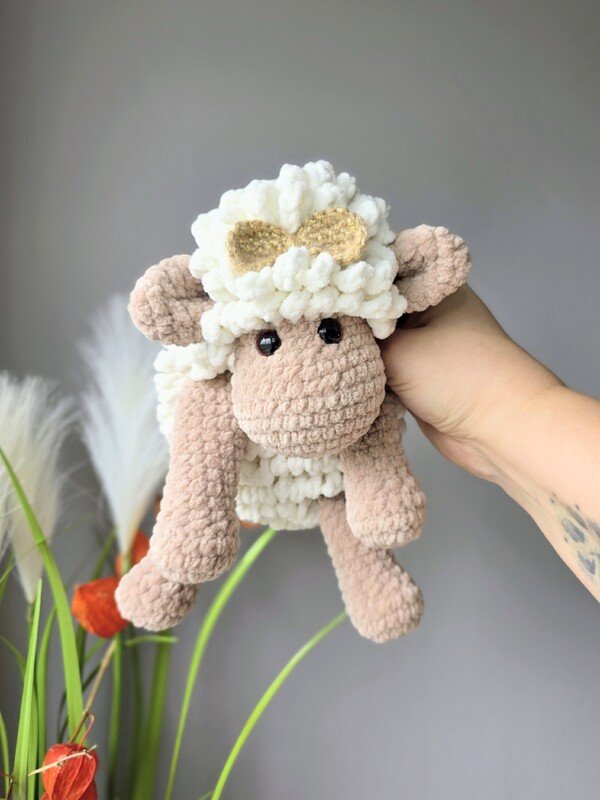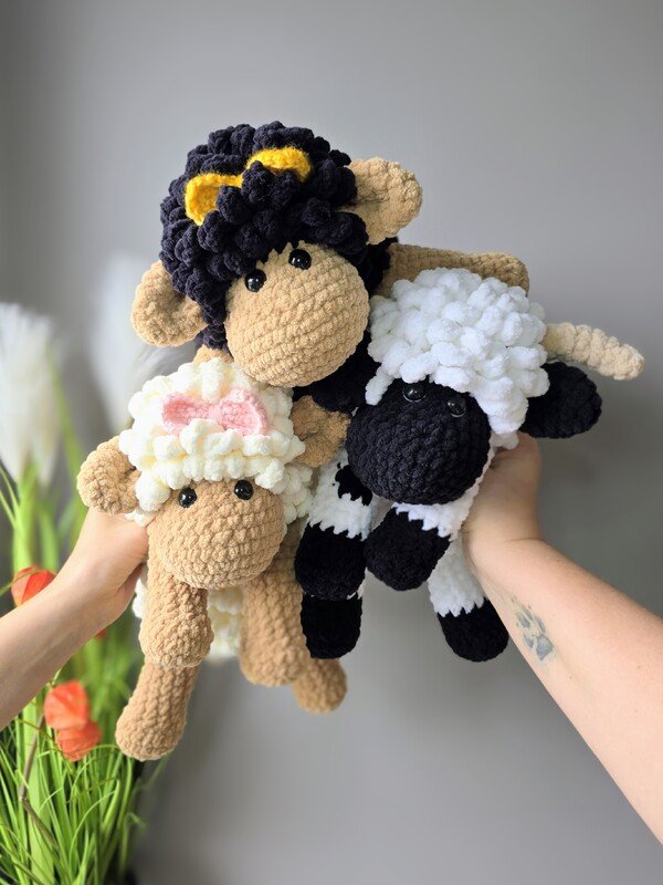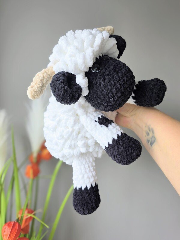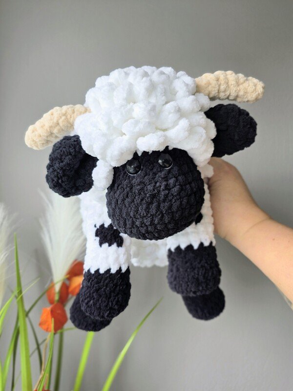 Das Schaf wird mit den angegebenen Materialien ca. 27 cm groß, gemessen vom Kopf bis zum Po (sitzende Position). Das Schaf ist für Babys bis zum Erwachsenen geeignet und auch als Deko für Deine Couch.