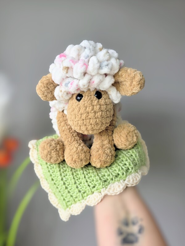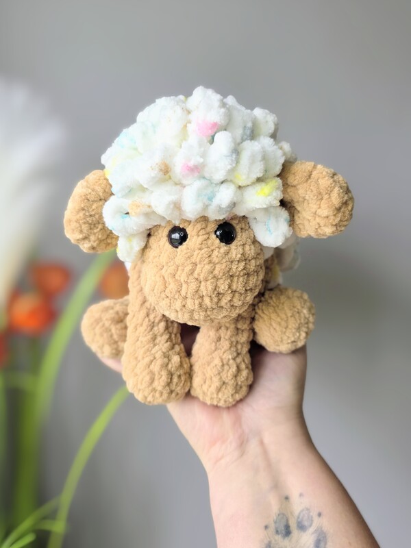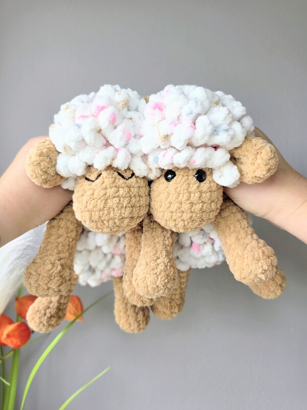 Das Schaf wird mit den angegebenen Materialien ca. 20 cm groß, gemessen vom Kopf bis zum Po (sitzende Position). Das Schaf ist für Babys bis zum Erwachsenen geeignet.