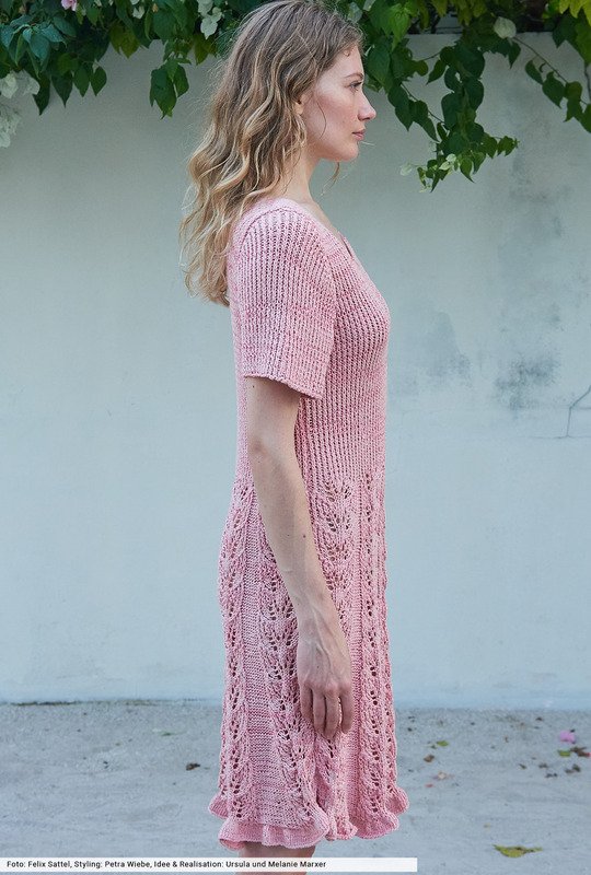 für das Kleid:- ONLINE "Linie 545 Mirella" (79% Baumwolle, 21% Viskose, LL = 120 m/50 g)- 550 (600) 650 g Rosa (Fb 06)