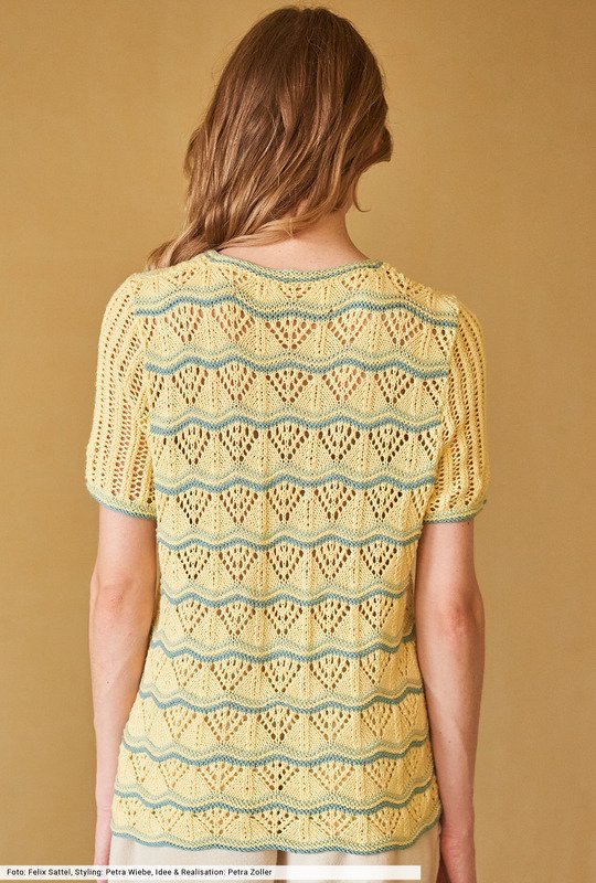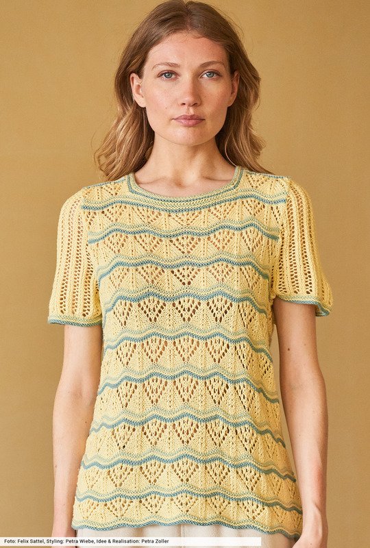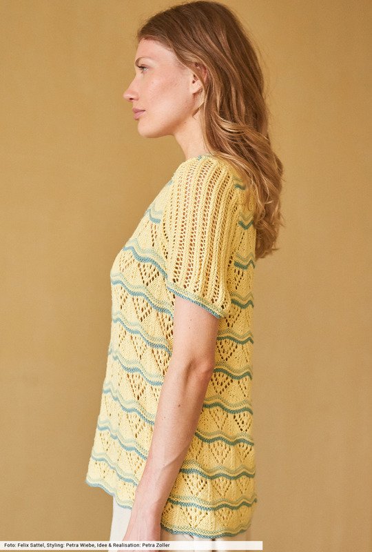 Der frische Gelbton steht für einen klaren Sommerlook, der durch schmale Streifen in Hellblau und Mint aufgewertet wird. Hinzu kommen für den Korpus weiche Wellenstrukturen, für die du in der Anleitung eine übersichtliche Strickschrift findest. Für die Ärmel haben wir uns für eine transparente Lochmusteroptik, die viel Luft an die Haut lässt. So gehst du mit einem aparten Strickshirt natürlich leicht durch den Tag.
