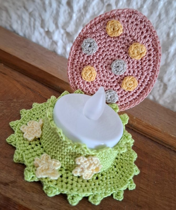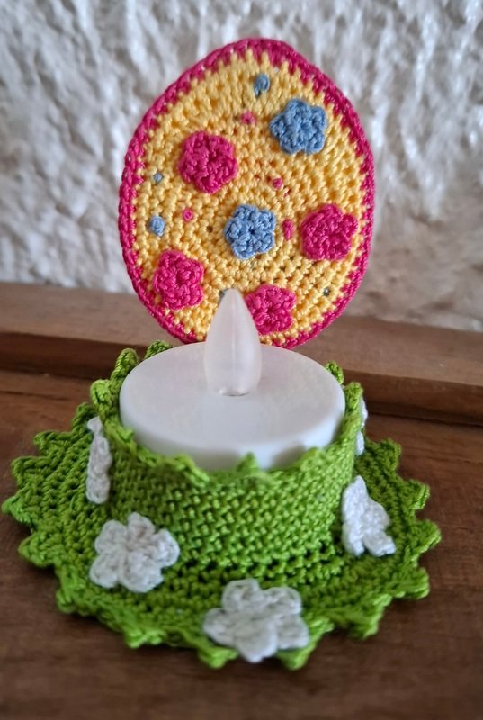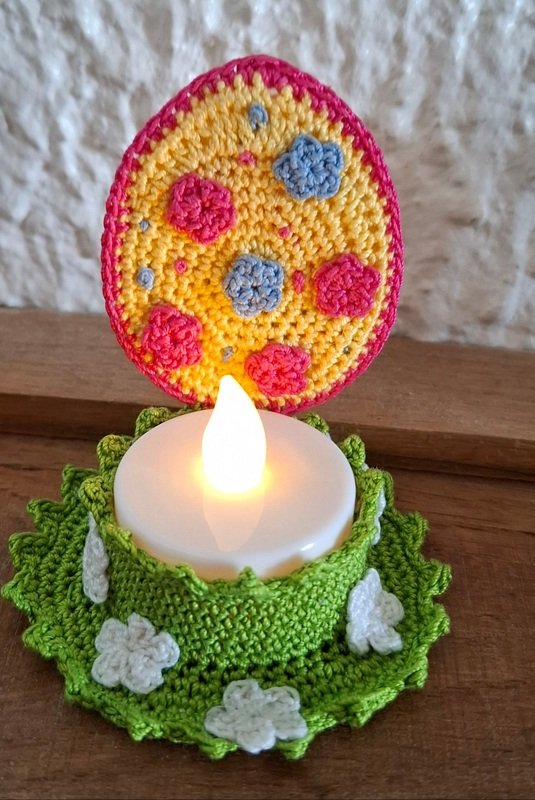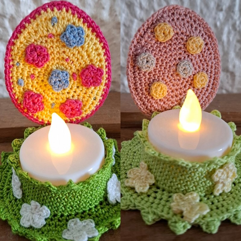 Mit dieser Anleitung kannst du ein süsses, Oster-Teelicht in Form eines kleinen Ostereis häkeln. Das Projekt ist schnell gemacht, perfekt als Last-Minute Osterdeko und eignet sich wunderbar als kleines Geschenk oder Tischdekoration.Das Design lässt sich individuell gestalten mit kleinen Blümchen, Punkten oder anderer Deko nach Wunsch.