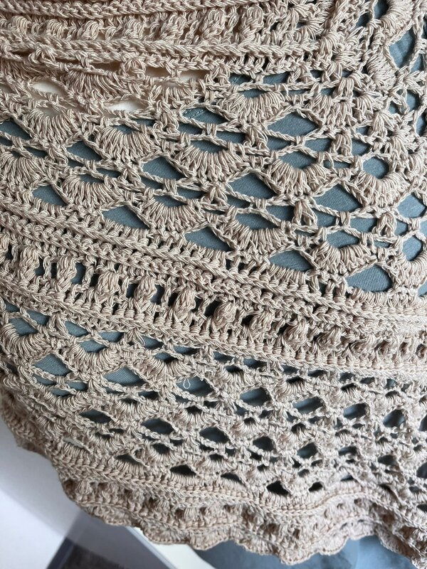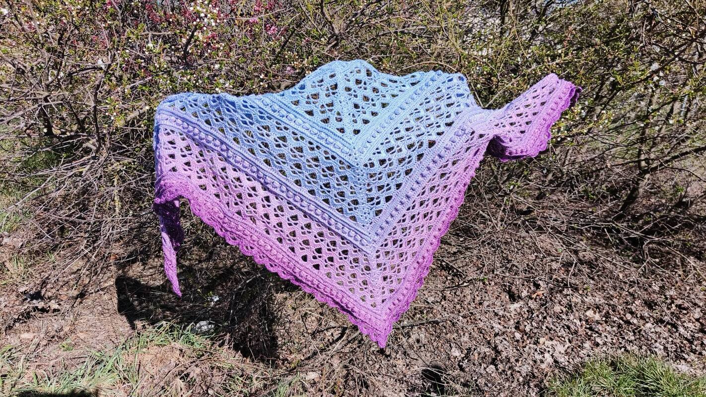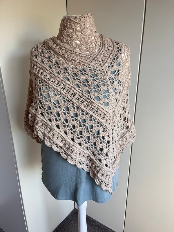 Das Tuch kann in jeder beliebigen Größe gehäkelt werden, da sich die Reihen wiederholen. Bitte beachte, wenn du eine andere Wolle verwendest, eine andere Nadelstärke, oder generelle lockerer/fester häkelst, kann die Größe variieren.