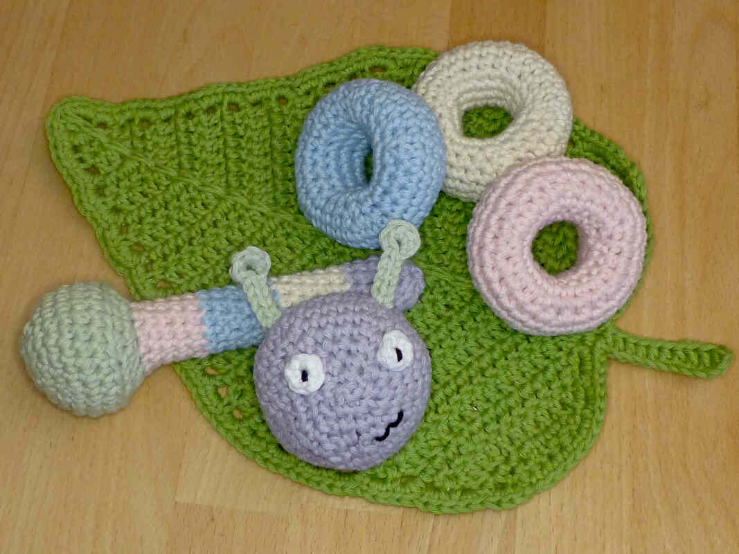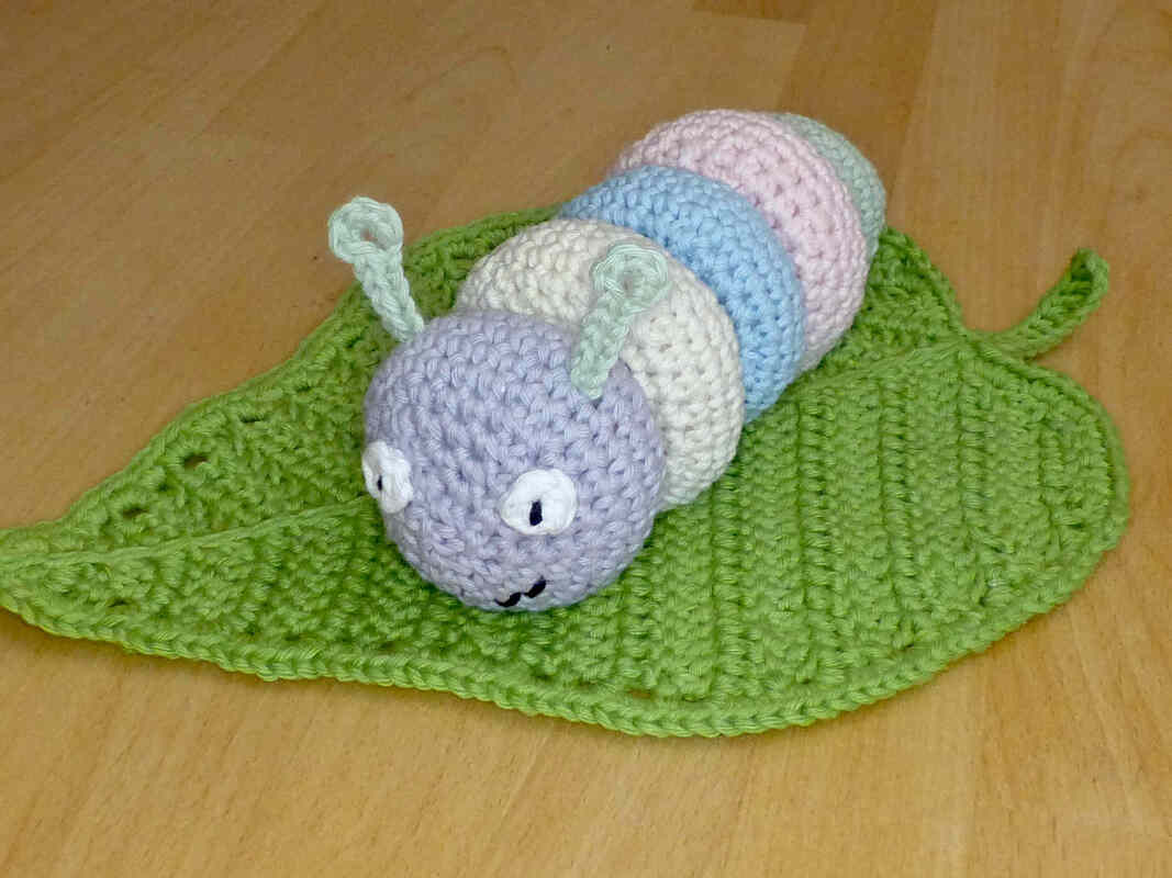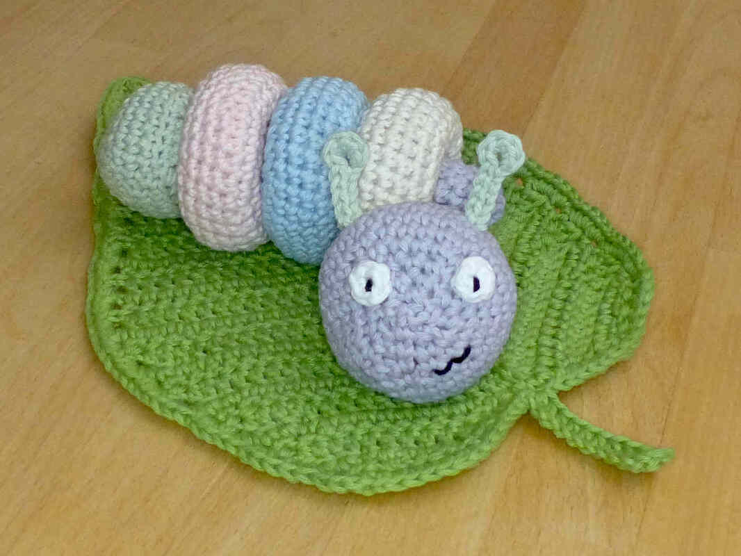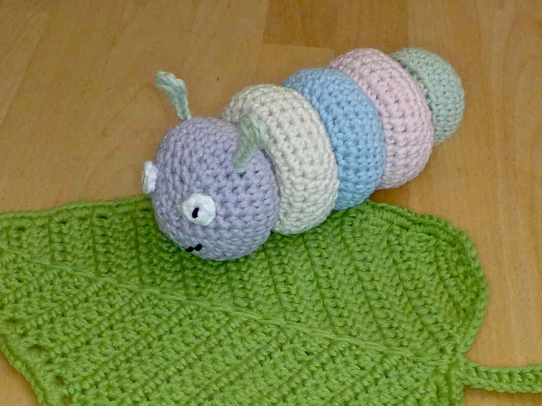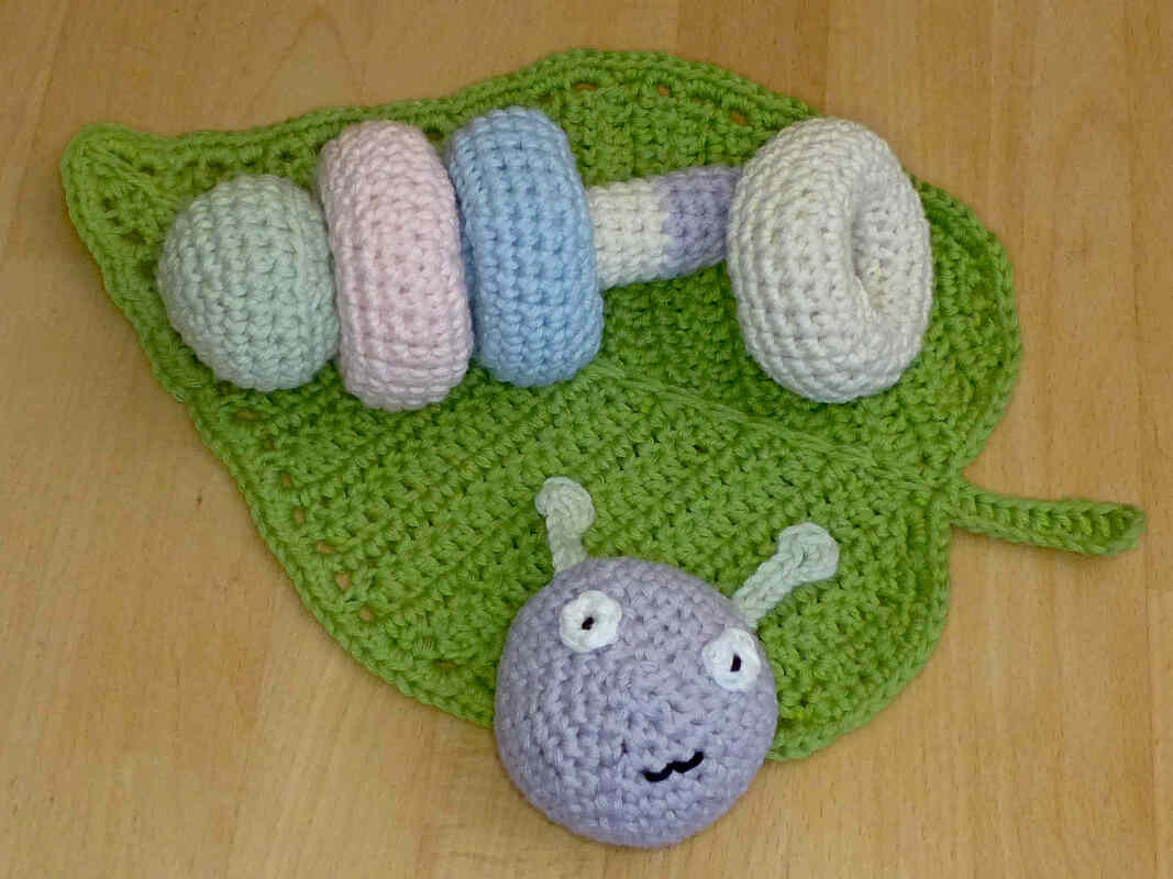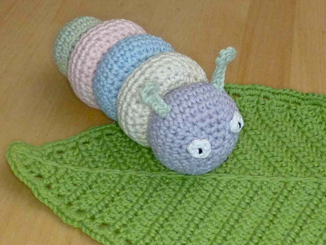 Gehäkeltes Spielzeug ist ideal für kleine Kinder. Da es weich ist, kann man sich damit nicht wehtun, es macht keine Kratzer oder störende Geräusche auf Möbeln und Parkett und geht nicht kaputt geht, wenn man es runterwirft. Häkel doch mal ein etwas anderes Steckspiel, mit dem Kleinkinder spielerisch ihre Motorik und logisches Denken trainieren können. 5 verschiedene Teile müssen richtig zusammengesteckt werden, um eine niedliche Raupe zu erhalten. Nach dem aufregenden Spiel kann dann mit dem Schmusetuch Blatt gekuschelt werden. Alle Einzelteile werden ausführlich beschrieben, mehr als 60 Fotos helfen dabei, den Herstellungsprozess zu veranschaulichen.