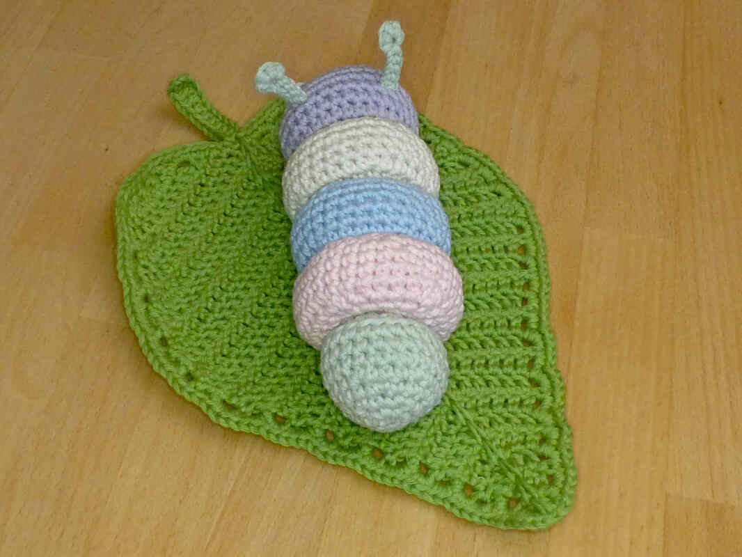 Bei Verwendung von Baumwollgarn mit einer Lauflänge von 85m/50g und Nadelstärke 3,5 wird die Raupe ca. 17 cm lang und 6,5 cm breit. Das Blatt wird ca. 24 x 18 cm groß (ohne Stiel gemessen). Das fertige Spielzeug ist geeignet für Kleinkinder ab ca. 1 Jahr.