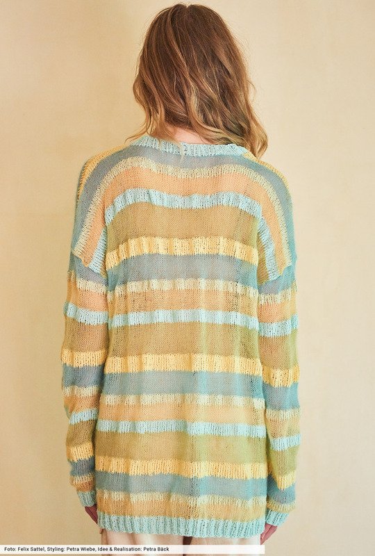 Frische Farben treffen auf fließende Silhouetten und verbinden Komfort mit moderner Klarheit. Bei diesem lässigen Pulli kommen auch Strickneulinge zum Erfolg, denn er wird nur glatt rechts gestrickt. Für Abwechslung sorgen die unterschiedlich breiten Streifen in Gelb, Pistazie oder Mint und zusätzlich die Kombination aus glattem Baumwoll-Leinengarn und flauschigen Mohairfasern. Ein Highlight für alle, die auf einfache Art und Weise von schichten Maschen einhüllt werden wollen.