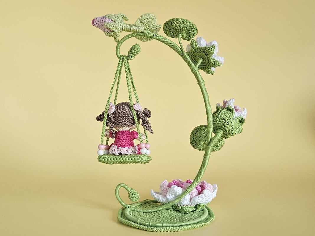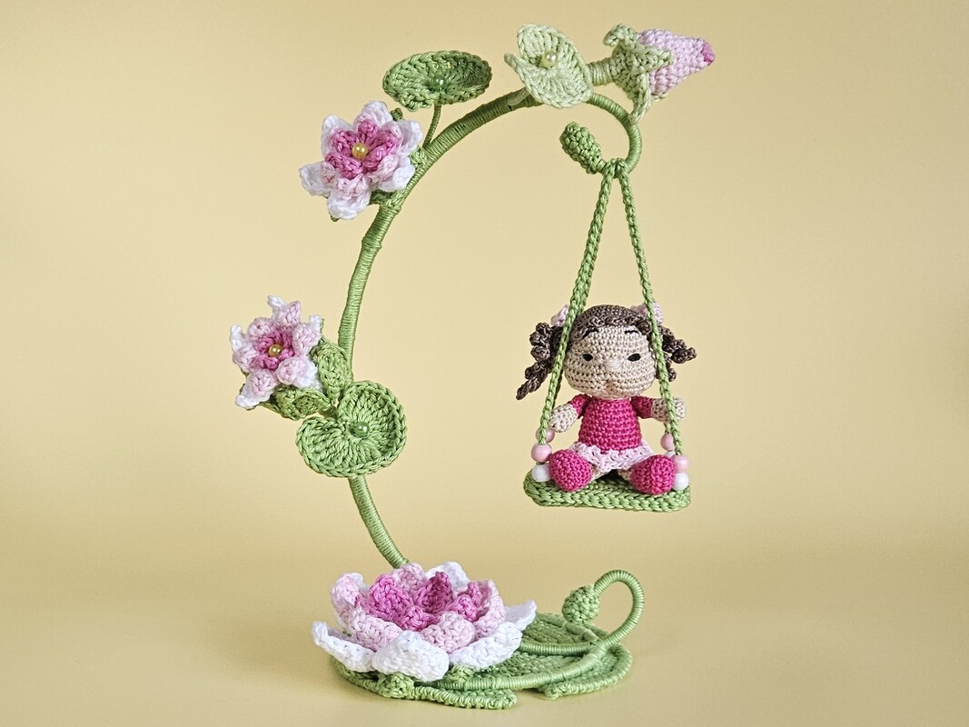 Yareli Seerose ist ein liebevoll gestaltetes Blumenkind, eingebettet in eine dekorative Szene aus Seerosenblättern, Blüten und einer filigranen Schaukel.