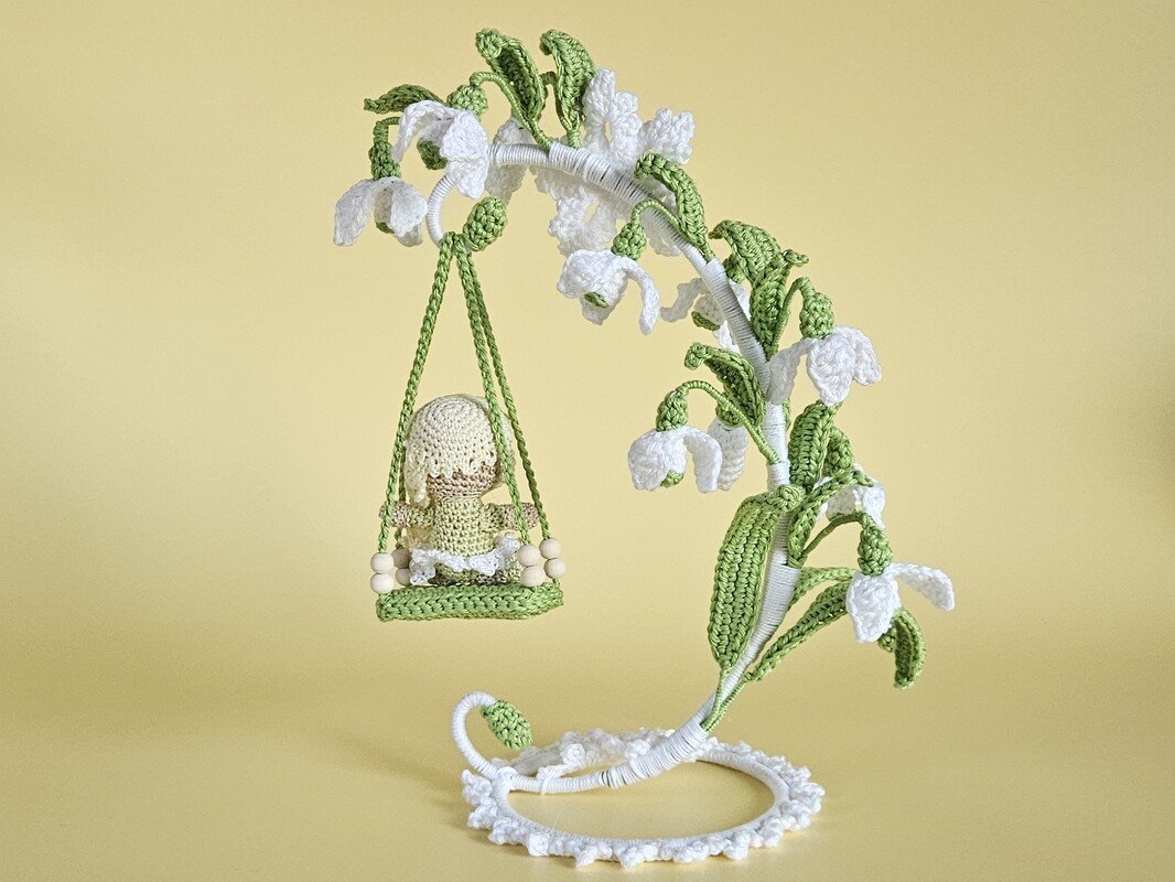 Elva Schneeglöckchen ist ein zartes Blumenkind, das zwischen filigranen Schneeglöckchen auf einer kleinen Schaukel sitzt und den Frühling mitbringt.