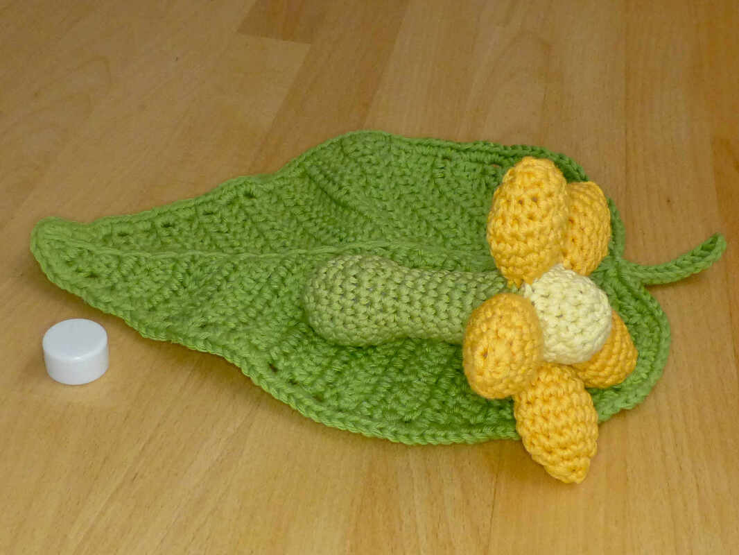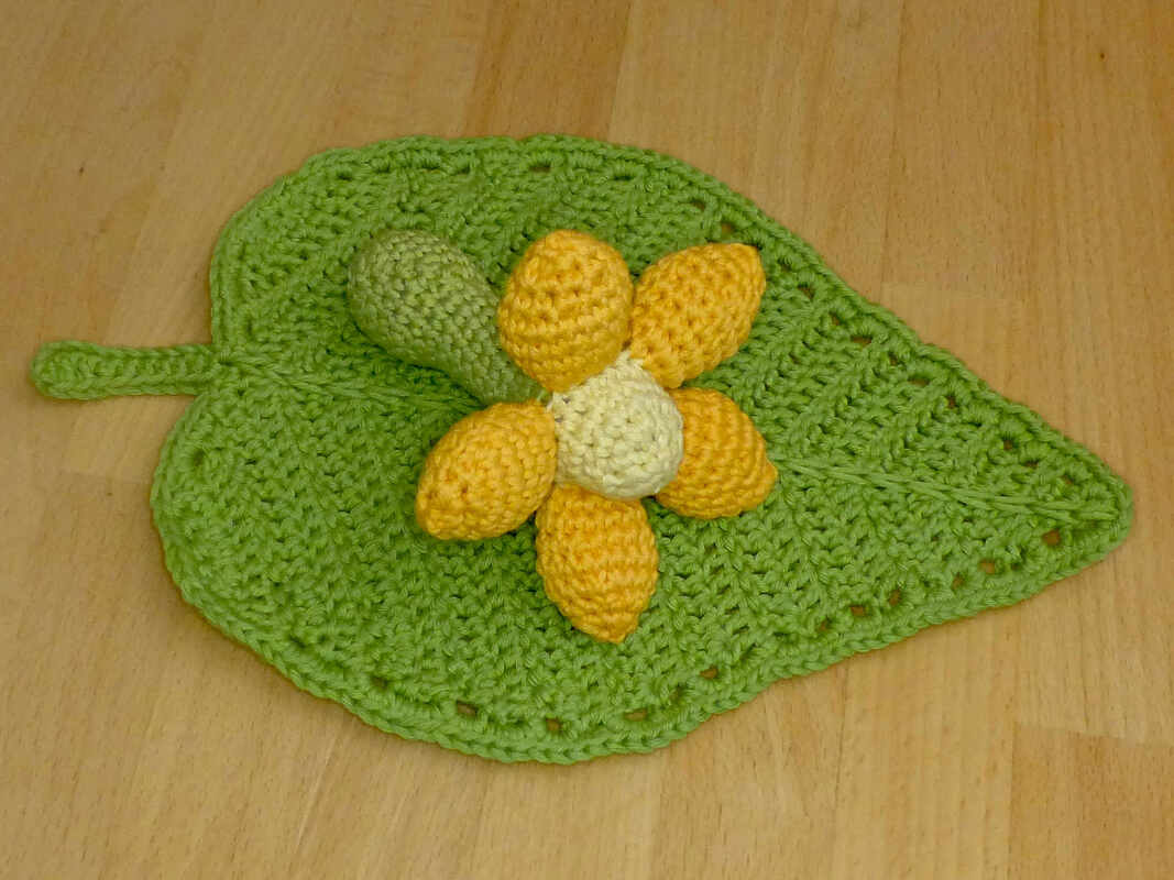 Bei Verwendung von Baumwollgarn mit einer Lauflänge von 90m/50g und Nadelstärke 3,5 wird die Blume ca. 11 cm lang und 10 cm breit. Das Blatt wird ca. 24 x 18 cm groß (ohne Stiel gemessen). Das fertige Spielzeug ist geeignet für Babys ab Geburt.