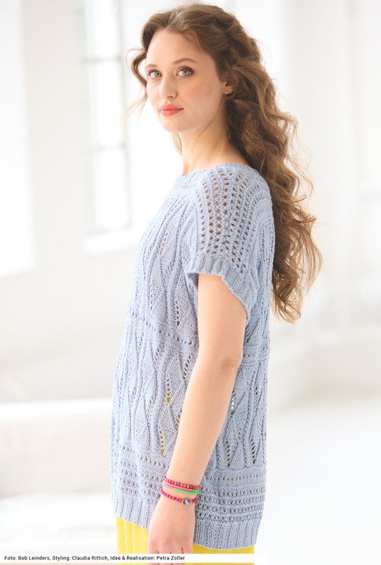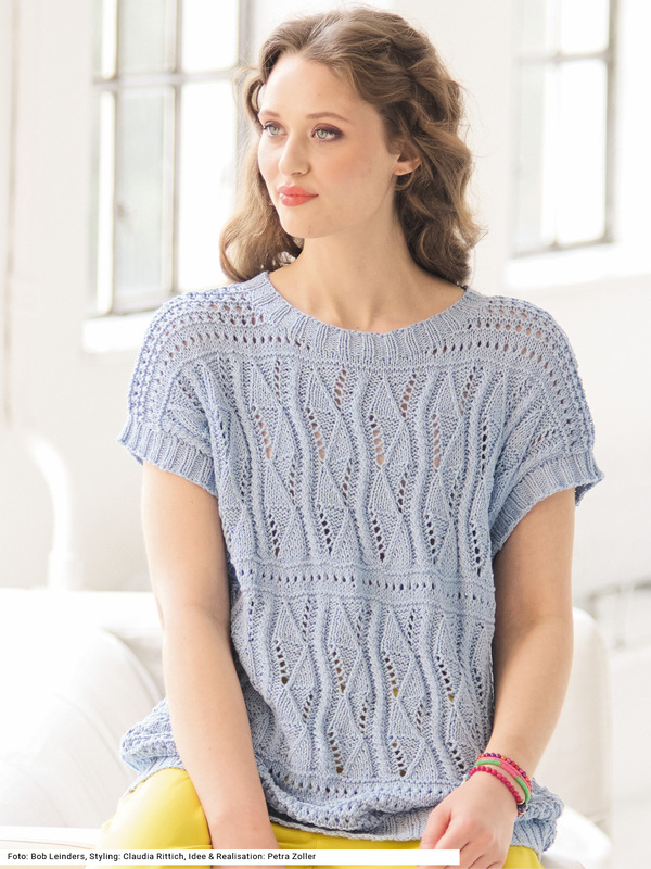 Dieses kurzärmelige Shirt macht allen Freude, die gerne Muster stricken. Eigentlich werden keine Ärmel gestrickt, denn der Schnitt ist ganz gerade, sodass die Schulterpartien weit überfallen und so den Eindruck von Ärmeln erzeugen. Ein vielseitiger Mustermix, bestehend aus glatt rechts, kraus rechts und kraus links, Lochmuster und Ajour-Zopfmuster punktet mit seinem Abwechslungsreichtum. Zudem lässt sich das Modell auch in der Übergangszeit als Pullunder über einem Langarmshirt oder einer Bluse gut tragen, besteht das Garn doch aus Baumwolle, Viskose und Leinen. Es gibt die Anleitung für die Größen 38 – 42 und 44 – 48 sowie 50 – 54**.**