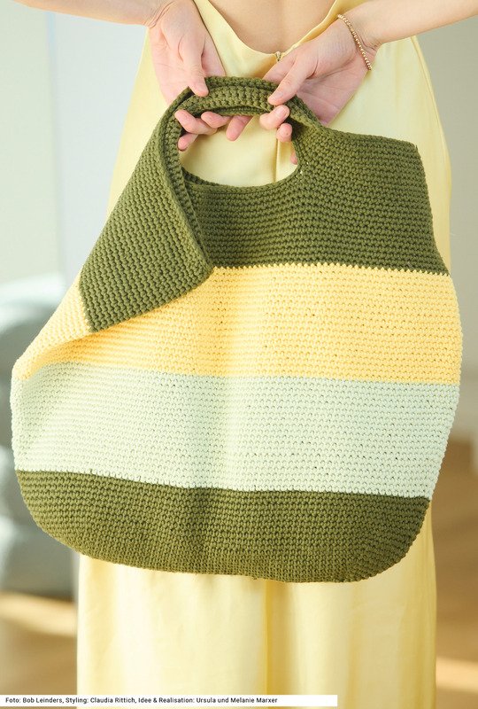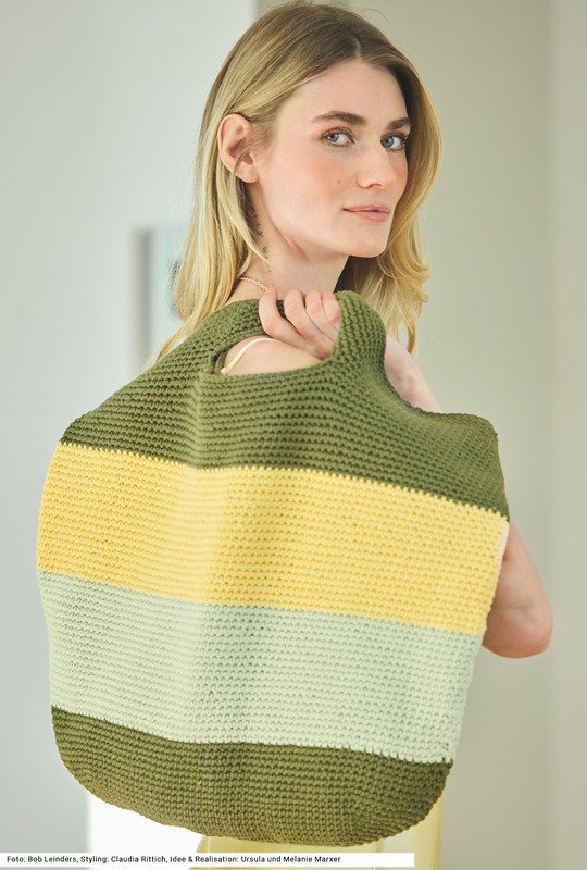 Ob Shopper für die Stadt oder große Badetasche für den Strand: Diese großzügige Häkeltasche beeindruckt mit ihren dominanten, breiten Blockstreifen in aktuellen Farben. Eingearbeitete Schlitze dienen dabei als praktische Griffe. Durch die dichte Häkelstruktur aus festen Maschen erhält das Modell Form und Stabilität (der oberte Rand wird noch mit einer Runde Kettmaschen umhäkelt) ein praktisch-moderner Begleiter also für jeden Tag. Die Anleitung dazu kann für eine Taschengröße von 53,5 x 46 cm downgeloadet werden.