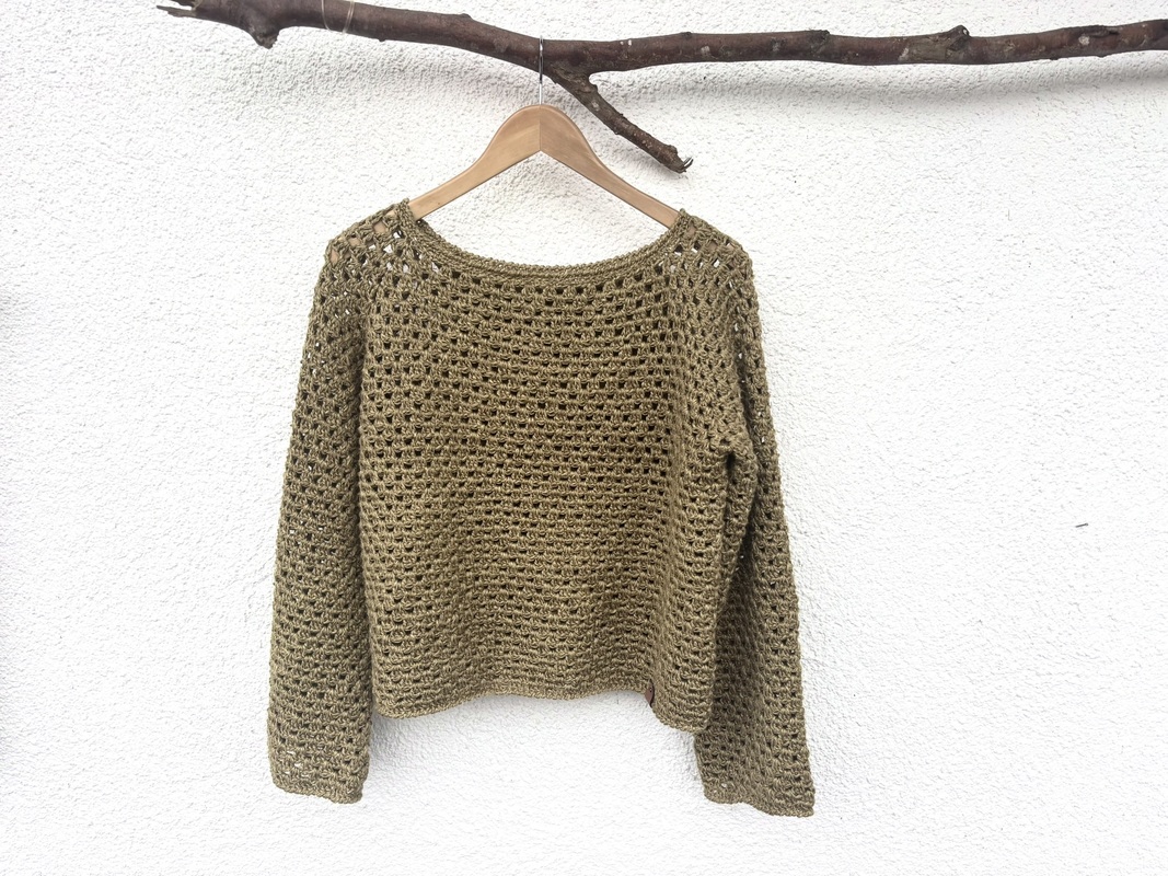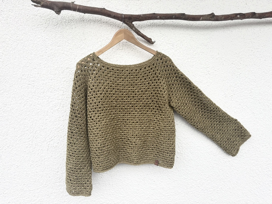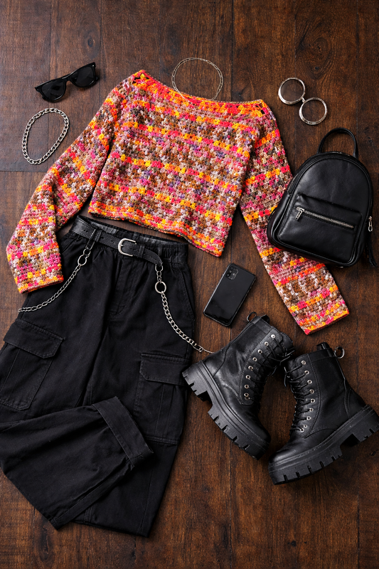 Ein stylisher Pullover, der sofort gute Laune macht: Dieses farbenfrohe Oberteil wird nahtlos von oben nach unten im Raglan gehäkelt – und das komplett ohne Zusammennähen. Das lebendige Granny-Muster in Kombination mit Farbverlaufsgarnen erzeugt spannende Farbspiele und eine lockere, luftige Struktur, während die durchdachte Konstruktion für eine bequeme Passform sorgt. Perfekt für alle, die entspannt häkeln und dabei ein echtes Lieblingsstück mit Charakter zaubern möchten.