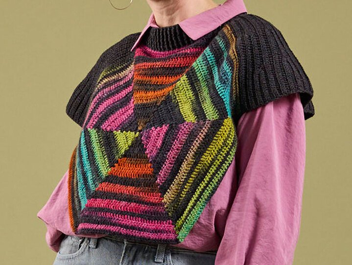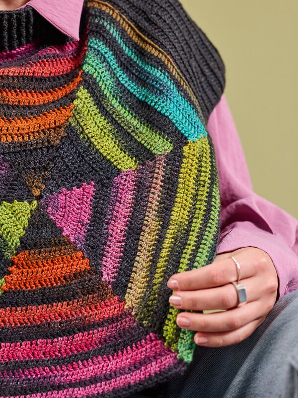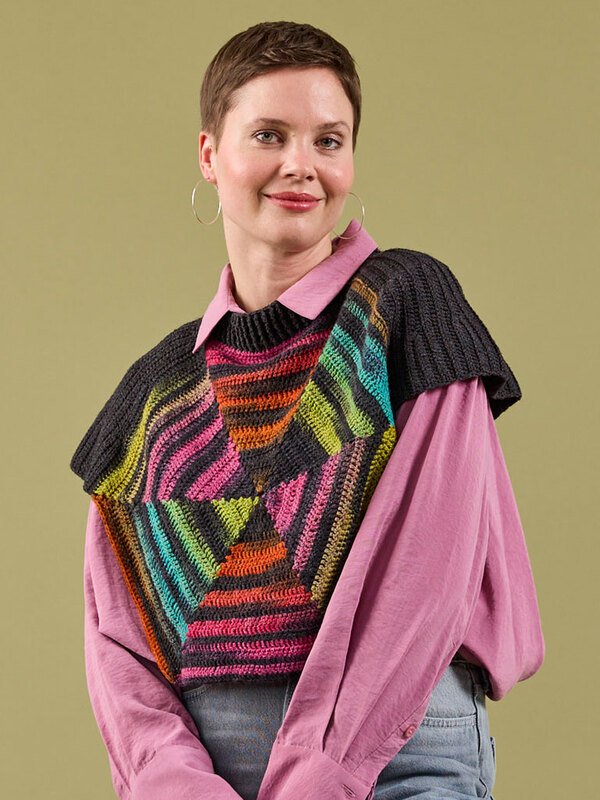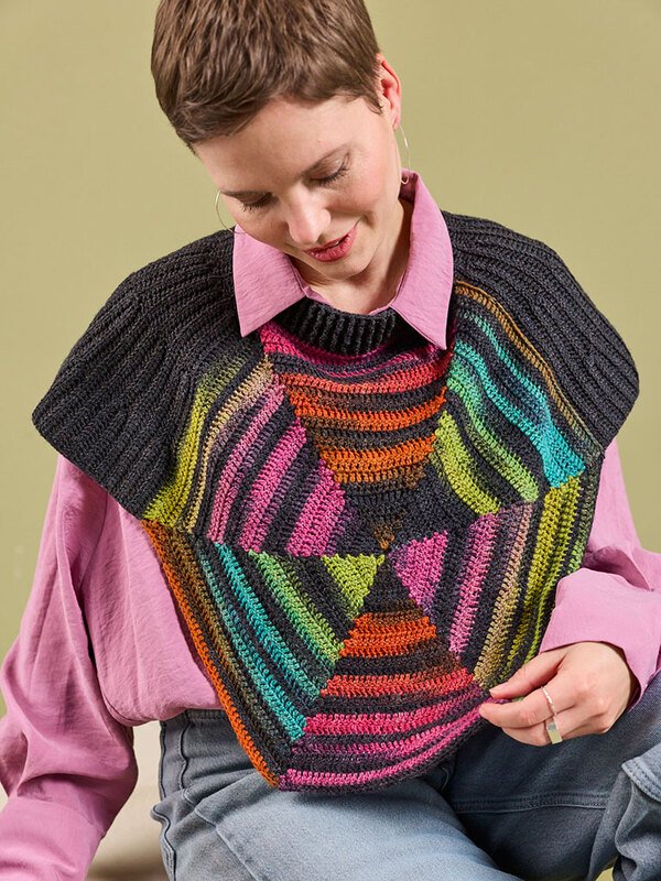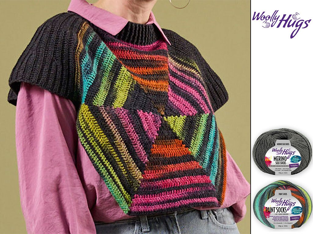 Dieser stylische Schulterwärmer aus Woolly Hugs PAINT SOCKS und MERINO SILK SOCKS kombiniert moderne geometrische Farbeffekte mit einer klassischen Rippenstruktur. Das kunstvolle Accessoire wertet jedes Outfit sofort auf und ist der ideale Begleiter für einen trendigen Lagenlook an kühlen Tagen.
