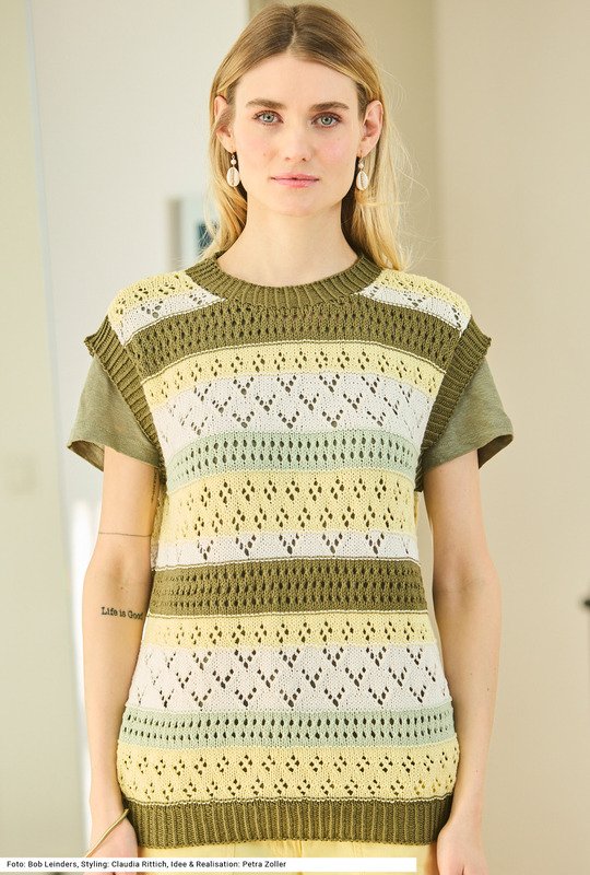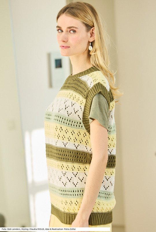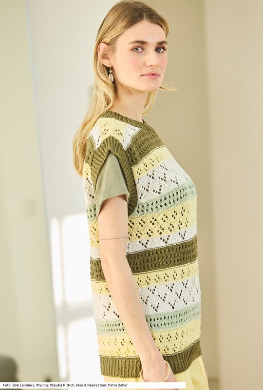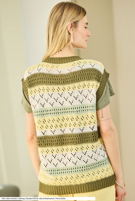 Dreierlei verschiedene Lochmuster, mal ein kleines Rautenmuster, mal ein streifiges Lochmuster, mal ein pfeilartiges Ajourmuster, ergeben einen spannenden Mix, vor allem auch durch das Aufeinandertreffen von gleich vier Farben. Dazukommt das besondere Garn aus Baumwolle und Soja, letzteres macht das Garn sehr weich. Dieser Pullunder kann auch prima als Top getragen werden. Der Bund und die Blenden an den Armausschnitten sowie um den runden Halsausschnitt werden im Rippenmuster 1 Masche rechts verschränkt, 1 Masche links gestrickt. Die Anleitung kann für die Größen 38/40, 42/44 und 46/48 downgeloadet werden.