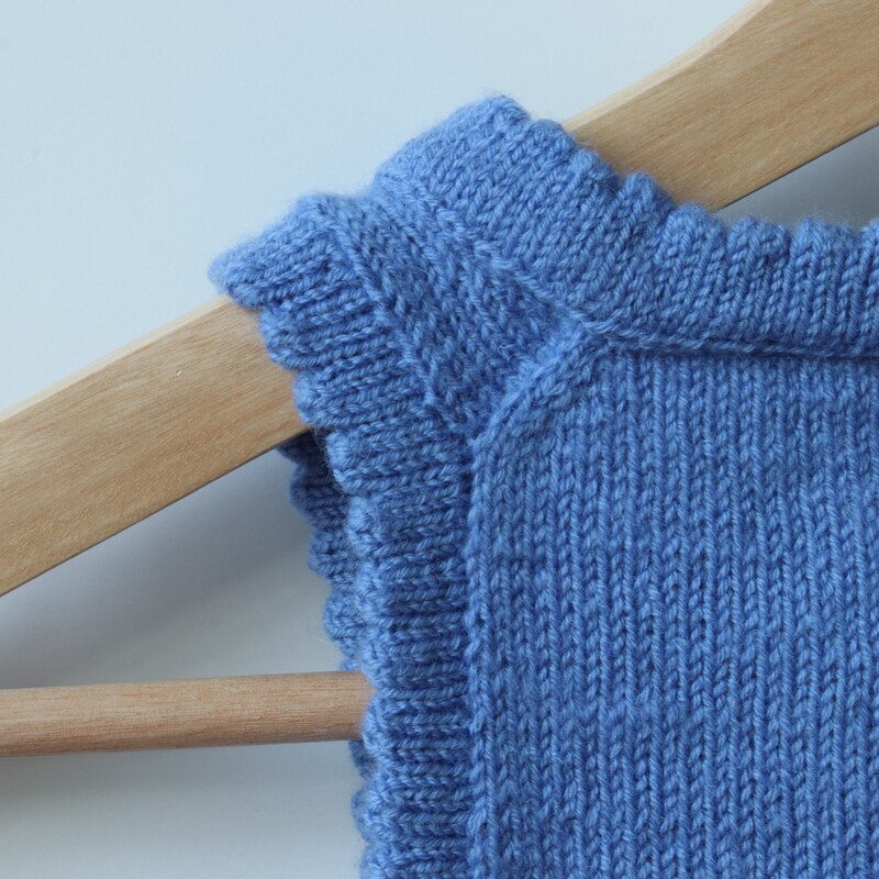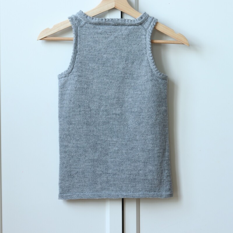 Das Top wird von oben nach unten gestrickt und lässt sich in der Länge individuell anpassen. Um die charakteristischen Umrandungen zu formen, werden entlang der Armausschnitte und des Halsausschnittes Maschen aufgenommen. Die Umrandungen an den Armausschnitten sind nach innen umgelegt und festgenäht, während die Umrandung am Halsausschnitt außen festgenäht wird – so entsteht ein bewusst gesetzter Kontrast im Detail.
