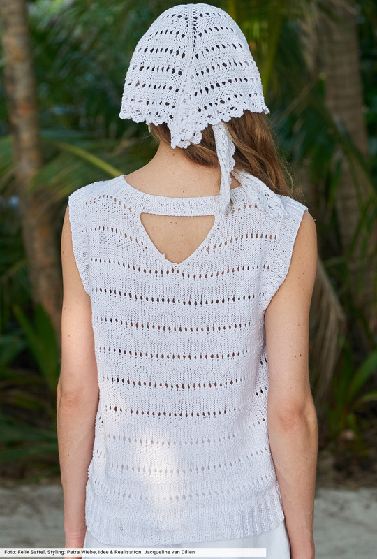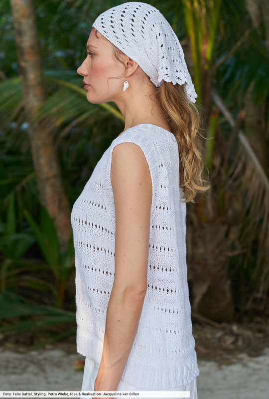 Weiße Tops sind jetzt unverzichtbare Begleiter. Dieses wird in wenigen Stunden durch die einfache Kombination aus Perlmuster- und Lochstreifen fertigstellt und harmoniert mit jedem Outfit. So richtig cool wird's aber erst mit dem Tuch: An kühleren Abenden bietet es dir Wärme, indem du es um den Hals schlingst. An heißen Tagen fungiert es als Sonnenschutz und sorgt für den lässigen Piratenlook.