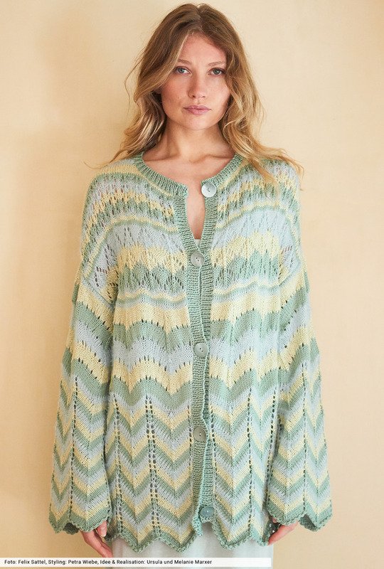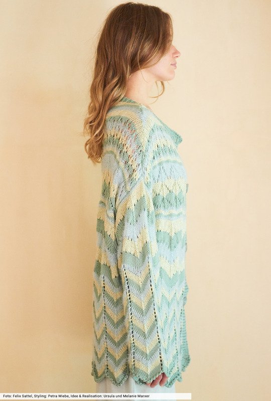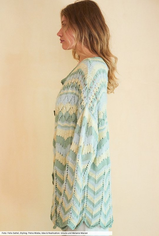 Material: LANA GROSSA "Promessa" (70% Baumwolle, 30% Polyamid, LL = 125 m/50 g) 250 (300) g Mintgrün (Fb 16), "Per Fortuna" (74% Baumwolle, 26% Polyamid, LL = 190 m/50 g) 200 (250) g Eisblau (Fb 18) und "Linarte" (40% Viskose, 30% Baumwolle, 20% Leinen, 10% Polyamid, LL = 125 m/50 g) 250 (300) g Limette (Fb 336). 1 Paar Stricknadel Nr 5,5 und 1 Rundstricknadel Nr 4,5 sowie 5 Knöpfe (Art 13612, Fb 02 Hellgrün, 28 mm Ø) von JIM KNOPF.