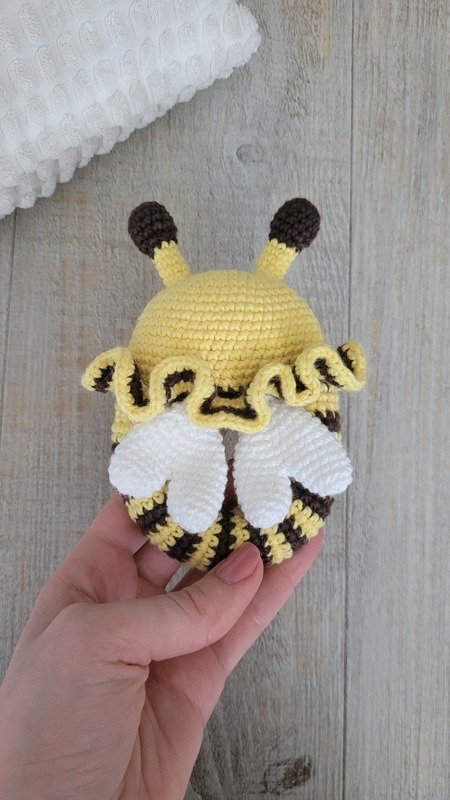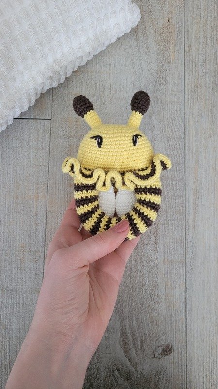 Mit dieser PDF-Häkelanleitung kannst du eine süße Bienen-Rassel mit Herzflügeln machen. Sie begeistert nicht nur für Babys, sondern auch Erwachsene. Das Spielzeug für Babys verbindet Greifling, Greifring, Beißring und Rassel. Es ist weich und babyfreundlich. Das detaillierte Muster führt dich Schritt für Schritt zu deinem frechen Bienchen mit Rock und Herzchenflügeln, das fröhlich rasselt und Herzen schmelzen lässt. Die Anleitung ist einfach zu verstehen. Sie ist gut für Anfänger und Fortgeschrittene geeignet. Die Amigurumi-Biene wird mit Baumwolle gehäkelt. Sie ist weich und perfekt für kleine Babyhände - ein selbstgemachtes Geschenk für jedes Baby.
