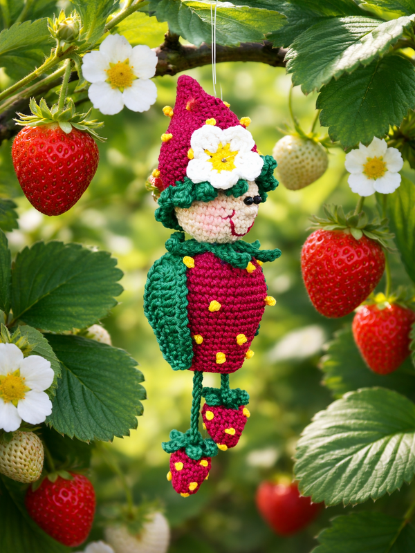 Mit dieser Anleitung zeige ich dir, wie du Fräulein Erdbeere mit Baumelbeinen häkeln kannst.