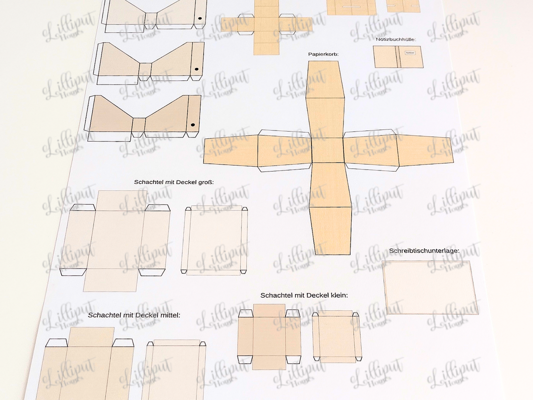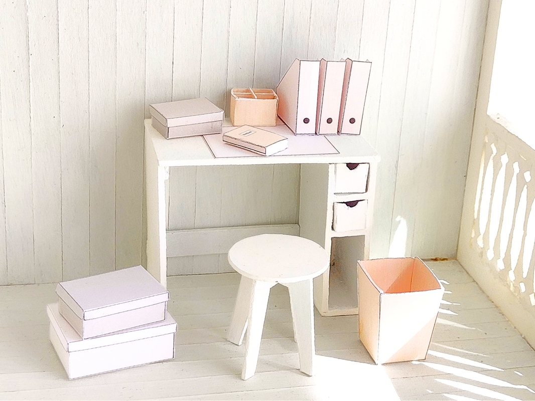 Der Bastelbogen enthält verschiedene Büro-Miniaturen in natürlichen Japandi-Farben, die du nach Belieben kombinieren kannst. So gestaltest du dein kleines Büro ganz individuell und kreativ.