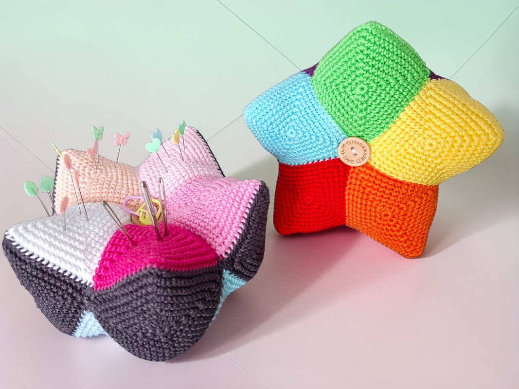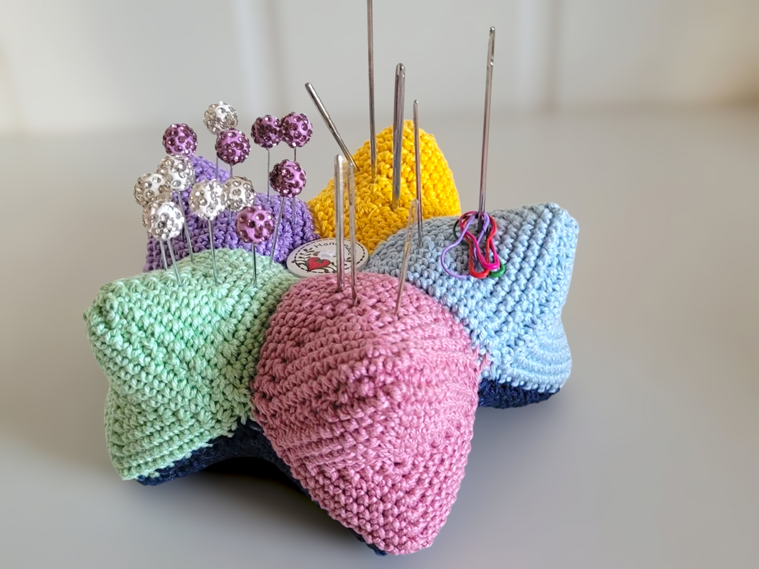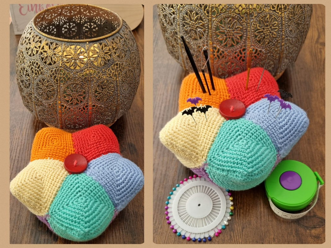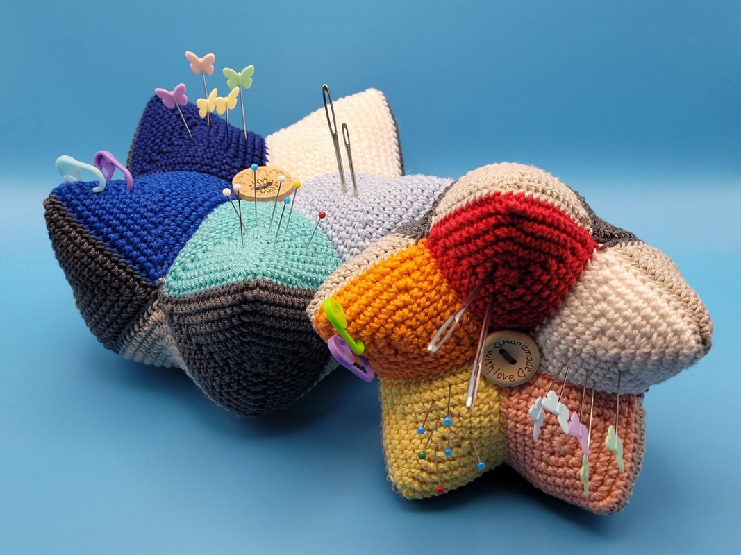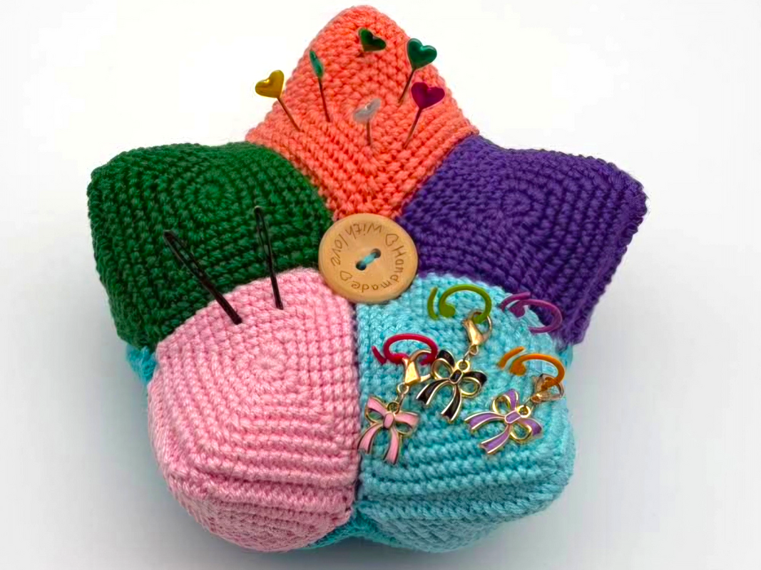 Dieses tolle Kronen Nadelkissen ist ein super Restefresser. Farblich ist hier alles möglich. Die Teile sind schnell gehäkelt und werden zum Schluß zur Krone zusammengesetzt. Hier finden Nadeln, Stecknadeln und Maschenmarkierer genug Platz.