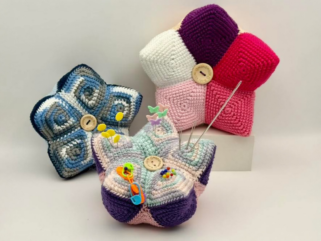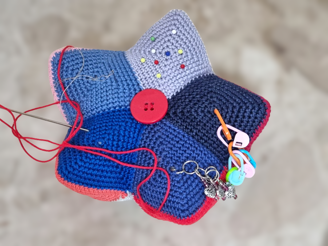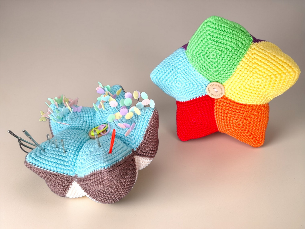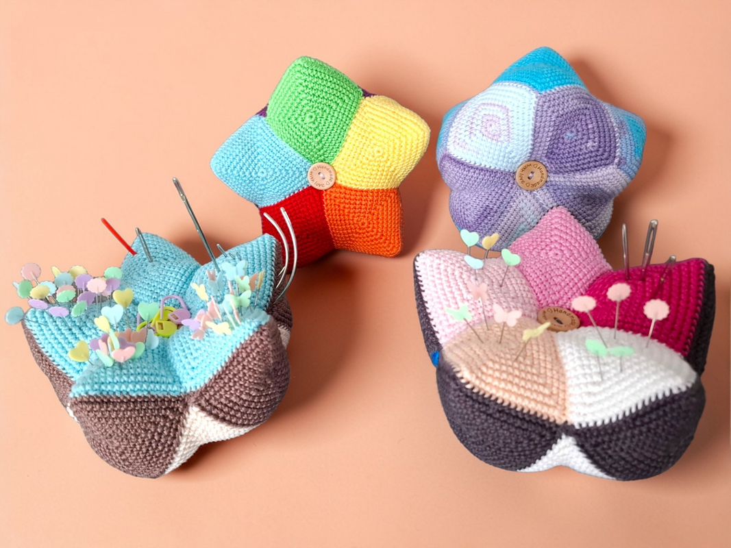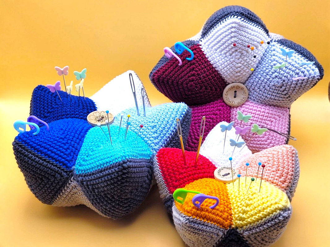Dieses tolle Kronen Nadelkissen ist ein super Restefresser. Farblich ist hier alles möglich. Die Teile sind schnell gehäkelt und werden zum Schluß zur Krone zusammengesetzt. Hier finden Nadeln, Stecknadeln und Maschenmarkierer genug Platz.