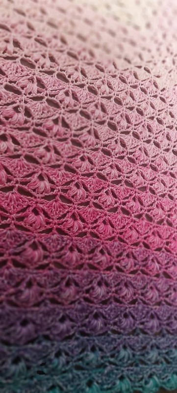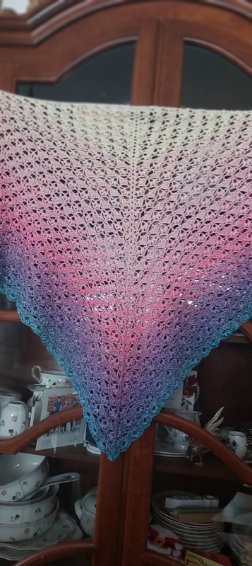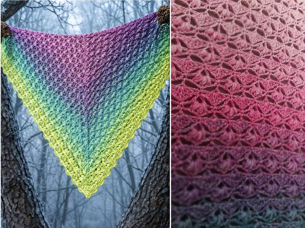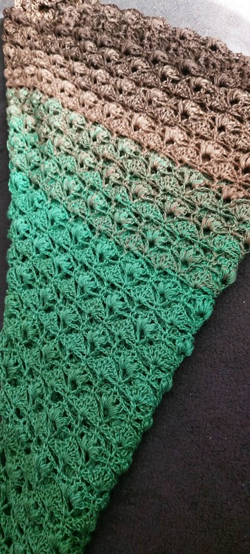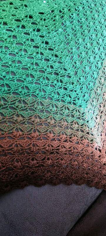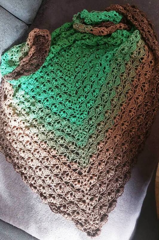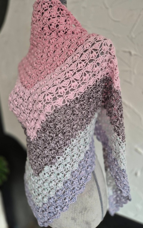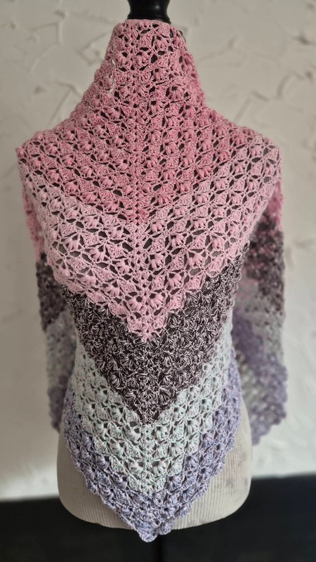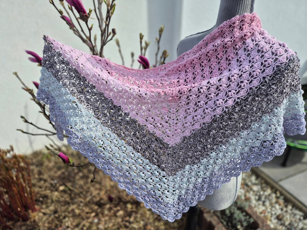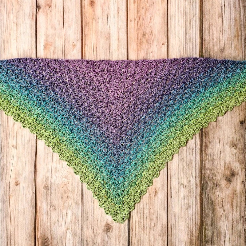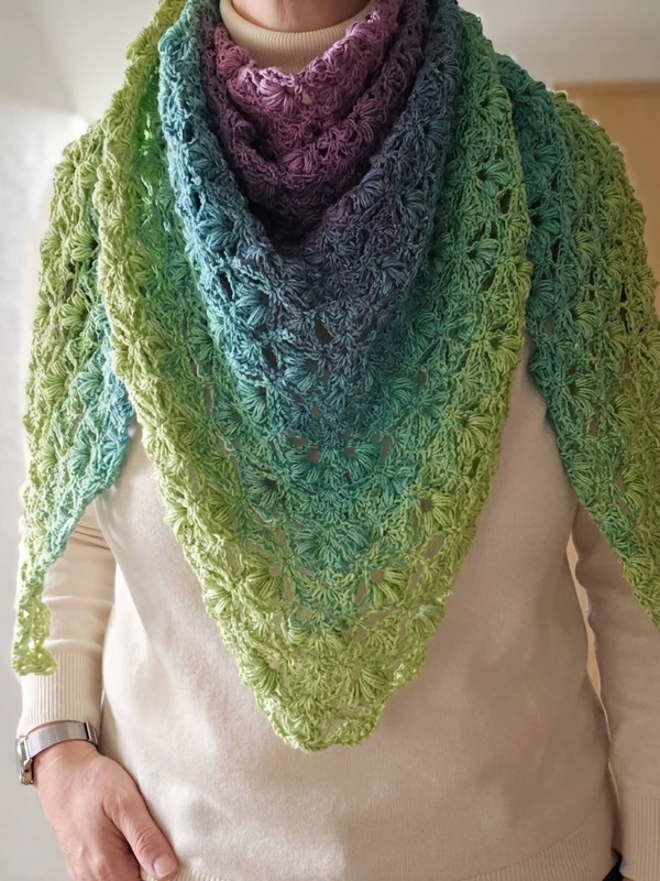 Es kann mit jedem gewünschten Garn gehäkelt werden, ich würde dazu einen Farbverlaufsbobbel mit mindestens 900 m empfehlen. Durch das Wiederholungsmuster kann das Tuch so groß gehäkelt werden wie gewünscht.