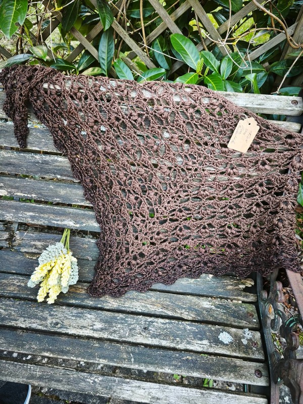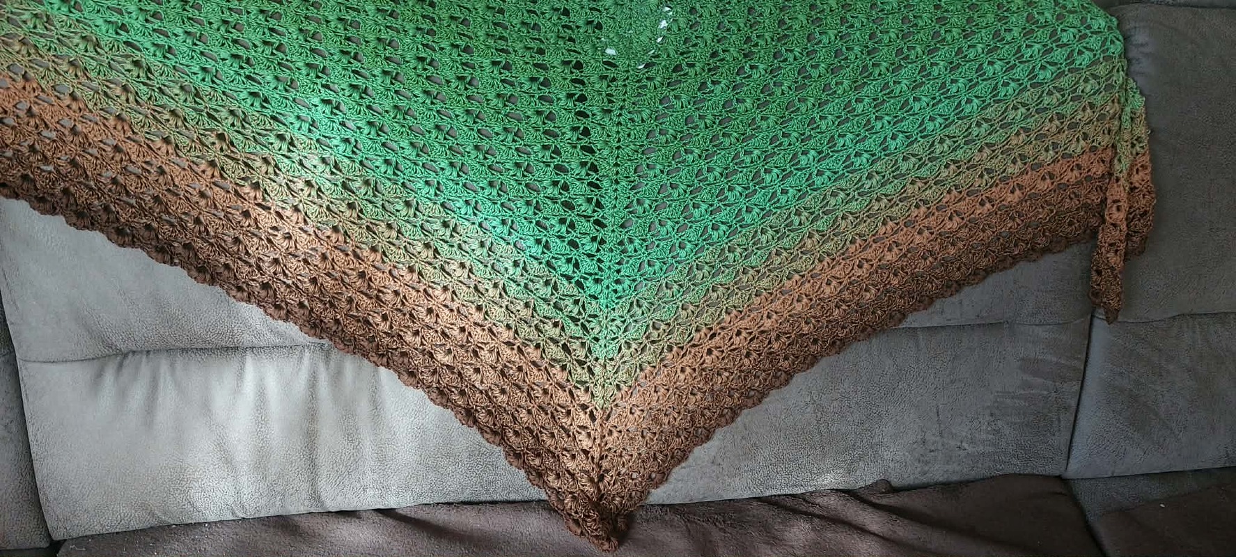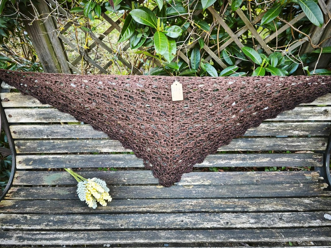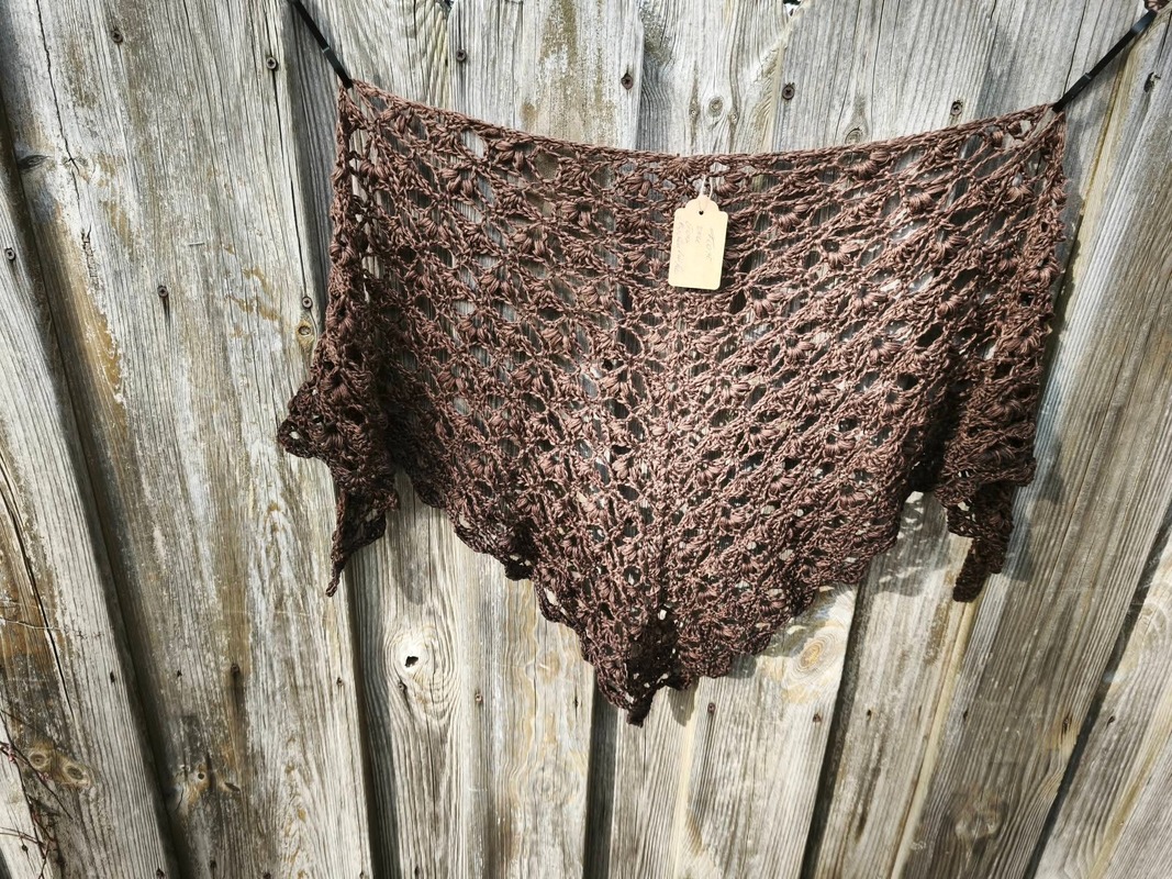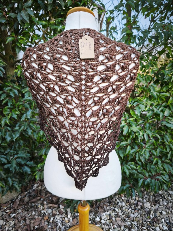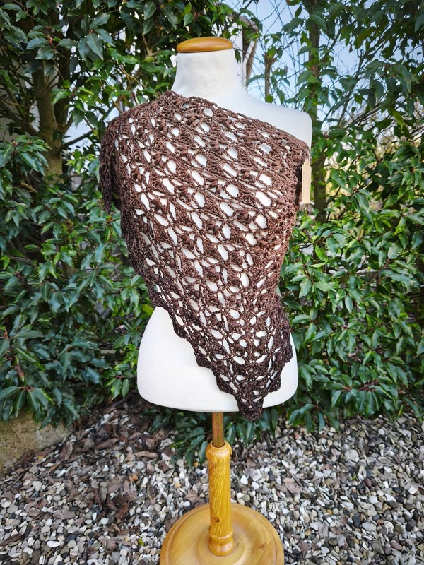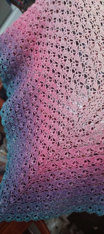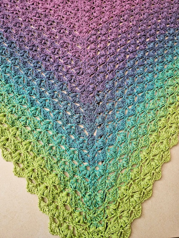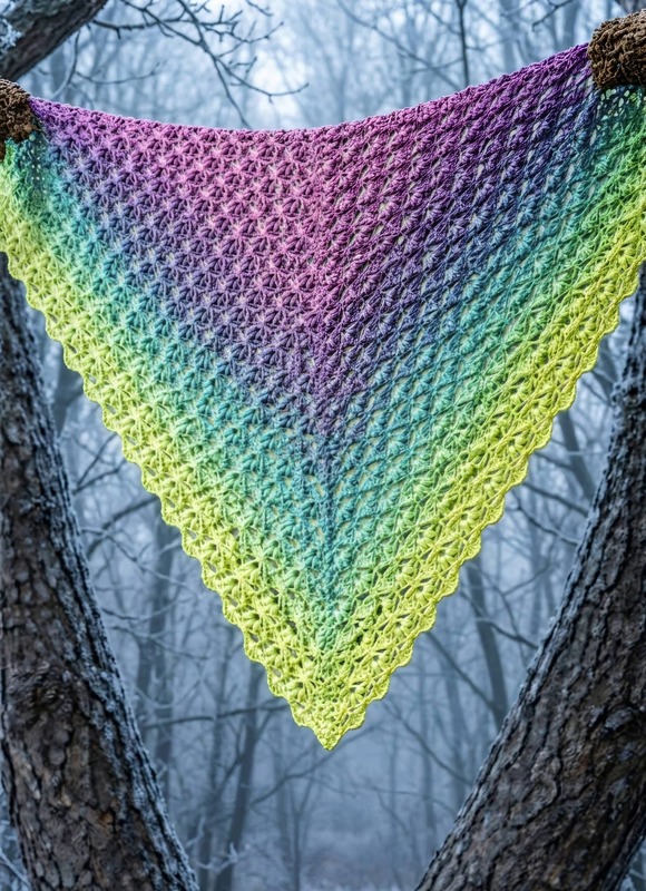Es kann mit jedem gewünschten Garn gehäkelt werden, ich würde dazu einen Farbverlaufsbobbel mit mindestens 900 m empfehlen. Durch das Wiederholungsmuster kann das Tuch so groß gehäkelt werden wie gewünscht.