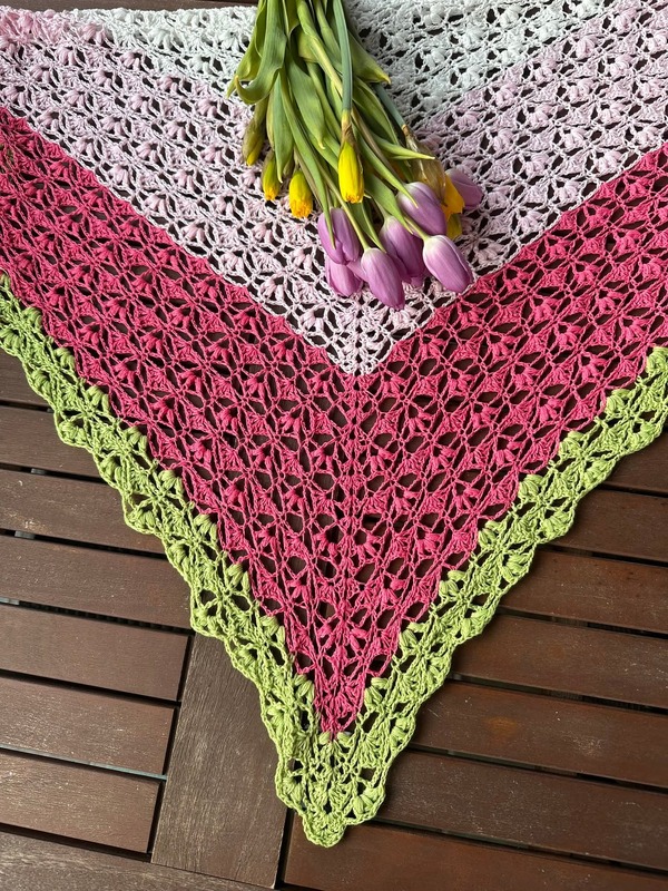 Was passt besser zum Frühling als ein Tuch voller Blumen (ital. Fiori)? Fiori ist ein Dreieckstuch aus einem wunderschönen und leicht zu verstehenden Wiederholungsmuster. Du bekommst mit dieser Anleitung eine genaue Häkelschrift, um ein Tuch in gewünschter Größe einfach selbst zu Häkeln.