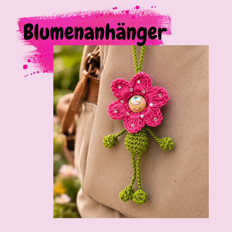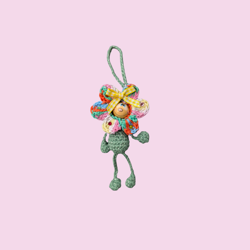 Dieser liebevoll gestaltete Blumenanhänger bringt sofort gute Laune! Mit seinem süßen Gesicht und den beweglichen „Armen und Beinen“ ist er ein echter Hingucker – perfekt als Taschenbaumler, Schlüsselanhänger oder kleines Geschenk.