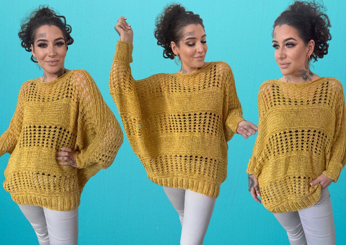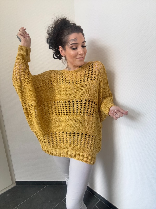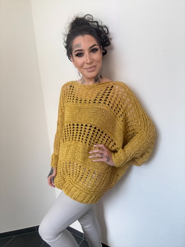 Der GOLDY wird komplett in einem Stück von unten nach oben gearbeitet. Keine Nähte, keine einzelnen Teile, kein zusätzlicher Aufwand für Ärmel. Alles entsteht fließend, Masche für Masche, bis sich der charakteristische Fledermausschnitt formt.