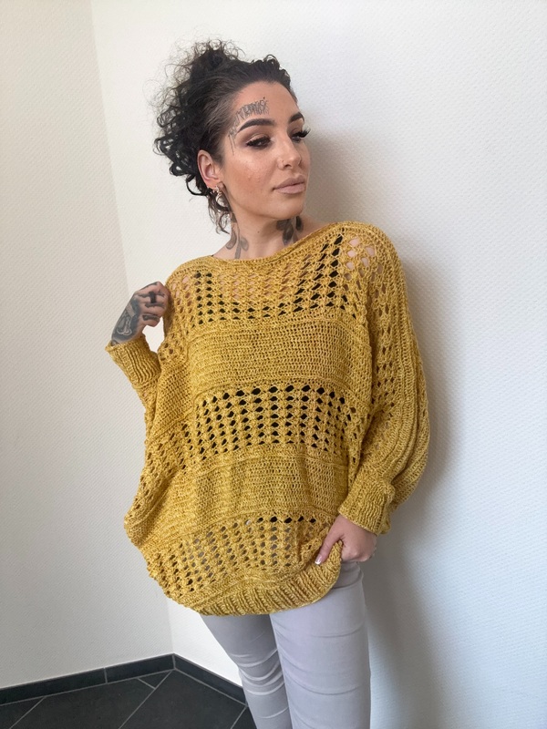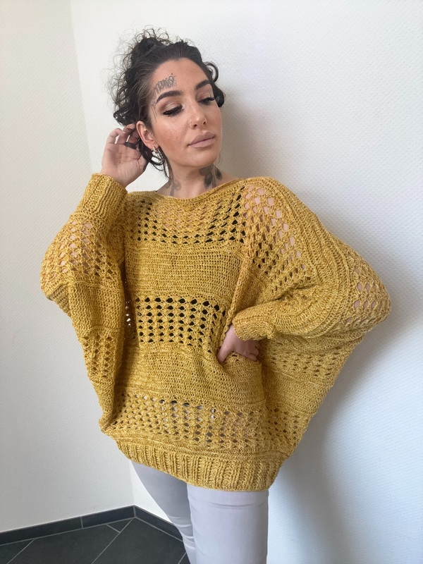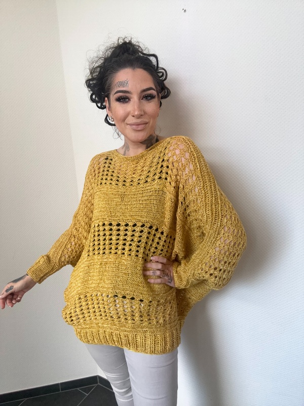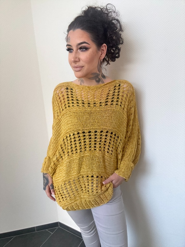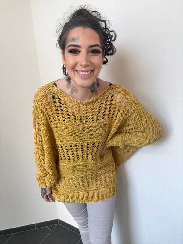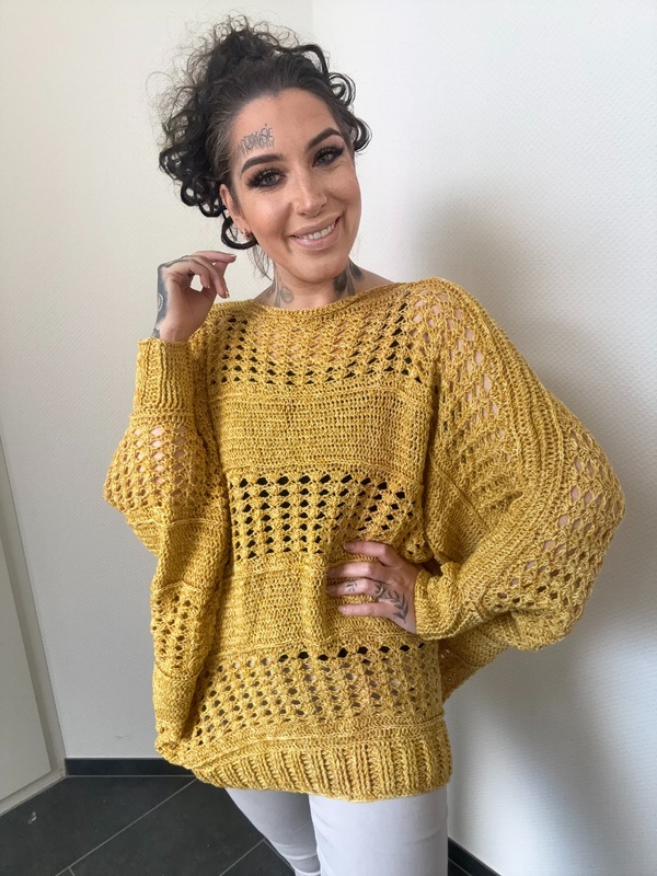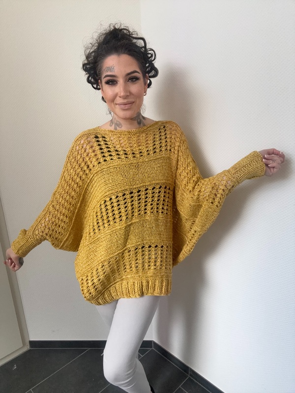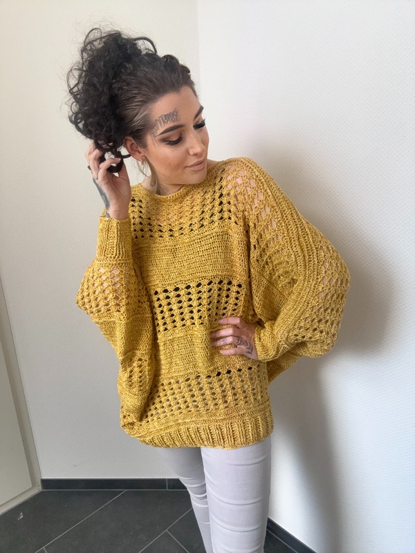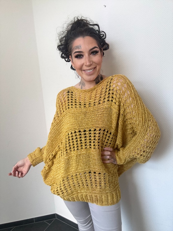 Dank der integrierten Ärmel ist er wunderbar anfängerfreundlich – einfach loshäkeln, abschalten und Schritt für Schritt dein neues Lieblingsstück entstehen lassen. Der Schnitt ist locker, weich fallend und schmeichelt jeder Figur, mit genau der richtigen Mischung aus Lässigkeit und Eleganz.