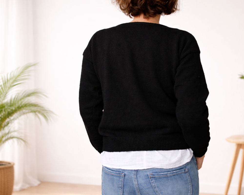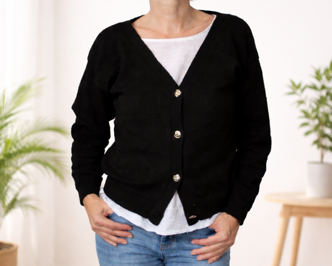 Dieser zeitlose schwarze Strick-Cardigan ist ein vielseitiges Basic für jede Garderobe und lässt sich sowohl elegant als auch lässig kombinieren. Der Cardigan überzeugt durch seine schlichte, moderne Silhouette und den klassischen V-Ausschnitt, der sich ideal für Layering über Blusen, Shirts oder leichten Tops eignet.