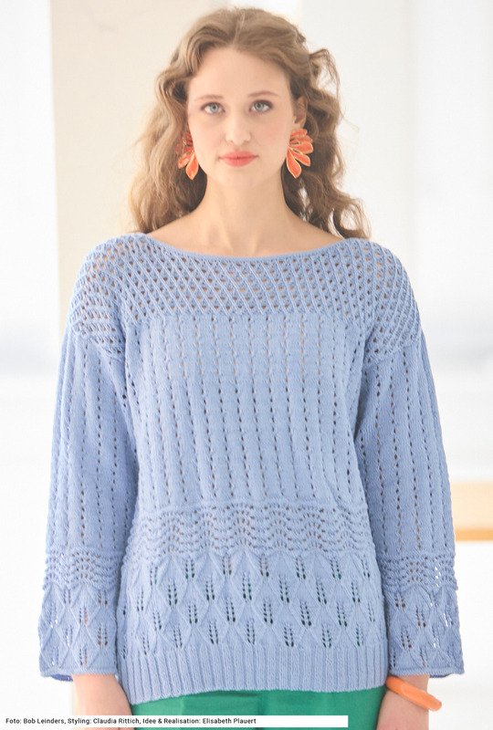 Langeweile beim Stricken? Bei diesem Pullover auf keinen Fall! Rippenmuster, Blatt- und Wellenmuster sowie Loch- und Flechtmuster garantieren maximalen Spaß für versierte StrickerInnen. Durch die vielerlei löchrigen Muster ist das Modell genau das Richtige für die Überganszeit oder einen kühleren Sommerabend. Für den Bund wird Rippenmuster gestrickt, die Ärmel beginnen mit glatt links und glatt rechts und der Halsausschnitt hat eine Blende in glatt links. Der zarte Glanz des Gestricks kommt vom hohen Viskoseanteil des ansonsten aus Baumwolle bestehenden Garns. Eine Anleitung kann für die Größen 38/40, 42/44 und 46/48 downgeloadet werden.
