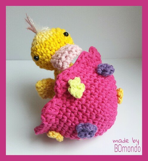benötigtes Material: • Baumwollgarn mit einer LL ca 70-85 m à 50 g (ca 20 g für kopf, Körper und Flügel, ca 10 g für Füße und Schnabel, ca 20 g für die Schale und bunte Reste für die Blumen